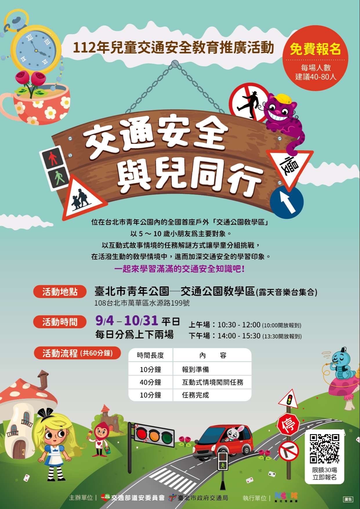為推廣兒童交通安全知能,透過辦理交通公園推廣活動, 讓兒童學會如何正確穿越路口及避開視野死角區等,以從中學習自我保護的能力,降低交通事故發生機率。本府交通局於今(112)年委託萬花筒劇團承辦「112年兒童交通 安全教育推廣活動」,訂於112年9月4日起至10月31日止預計舉辦30場次,活動地點位於臺北市萬華區青年公園內之交通公園教學區,須由各校自行前往,報名截止日期為112年7月6日,相關活動簡介及報名資訊詳附件。