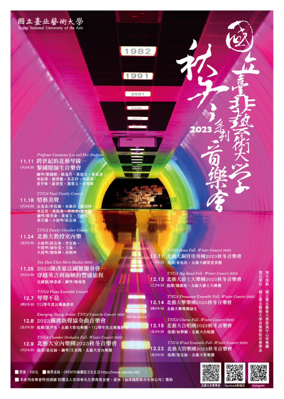 說明: 一、旨揭音樂會共12場,假本校展演藝術中心音樂廳(臺北市 北投區學園路一號)舉行。 二、相關活動訊息請至北藝大音樂學系網站(https://music. tnua.edu.tw) 查詢。