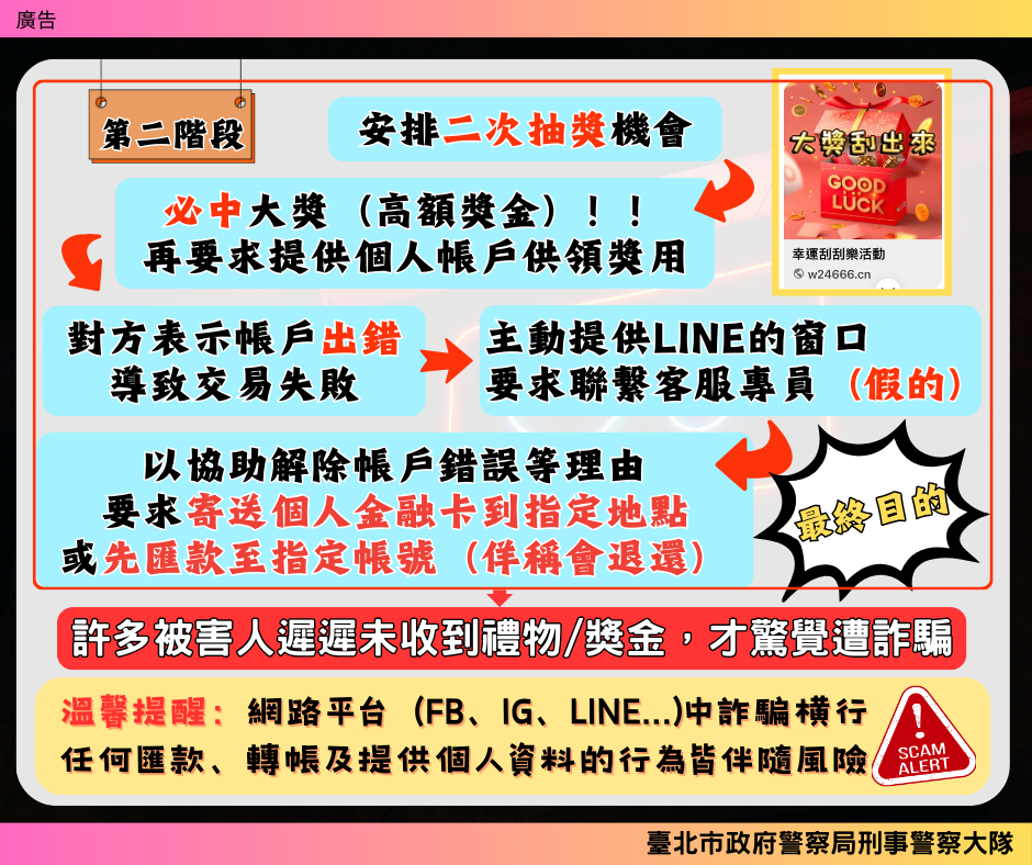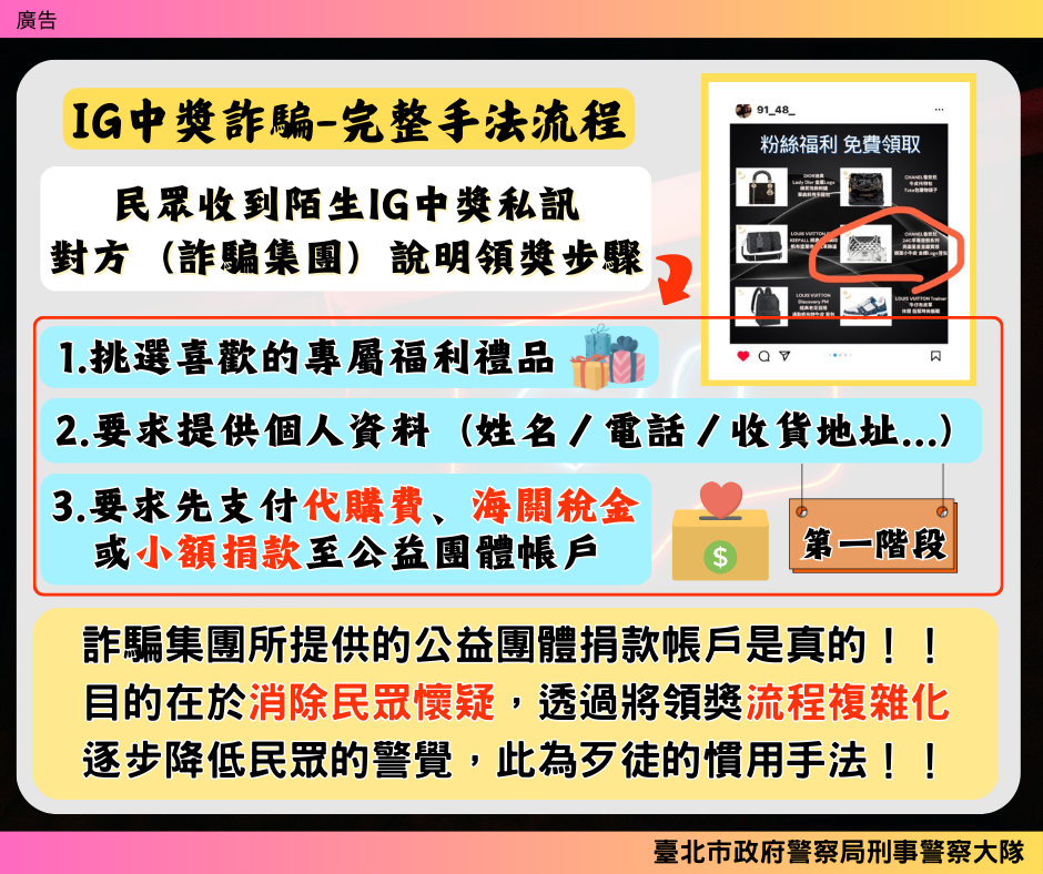 二、為賡續落實本市分齡分眾識詐宣導教育,本月以AI換臉詐 騙、新型態IG中獎詐騙為宣導主軸,彙整反詐影片1部、圖 片4張,均儲存於Google雲端連結