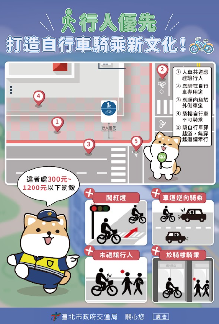 「自行車騎乘新文化-人行道篇」:自行車騎乘新文化, 禮讓行人優先、不按鈴催促,車靠外、人靠內,人車共 用空間互相尊重。