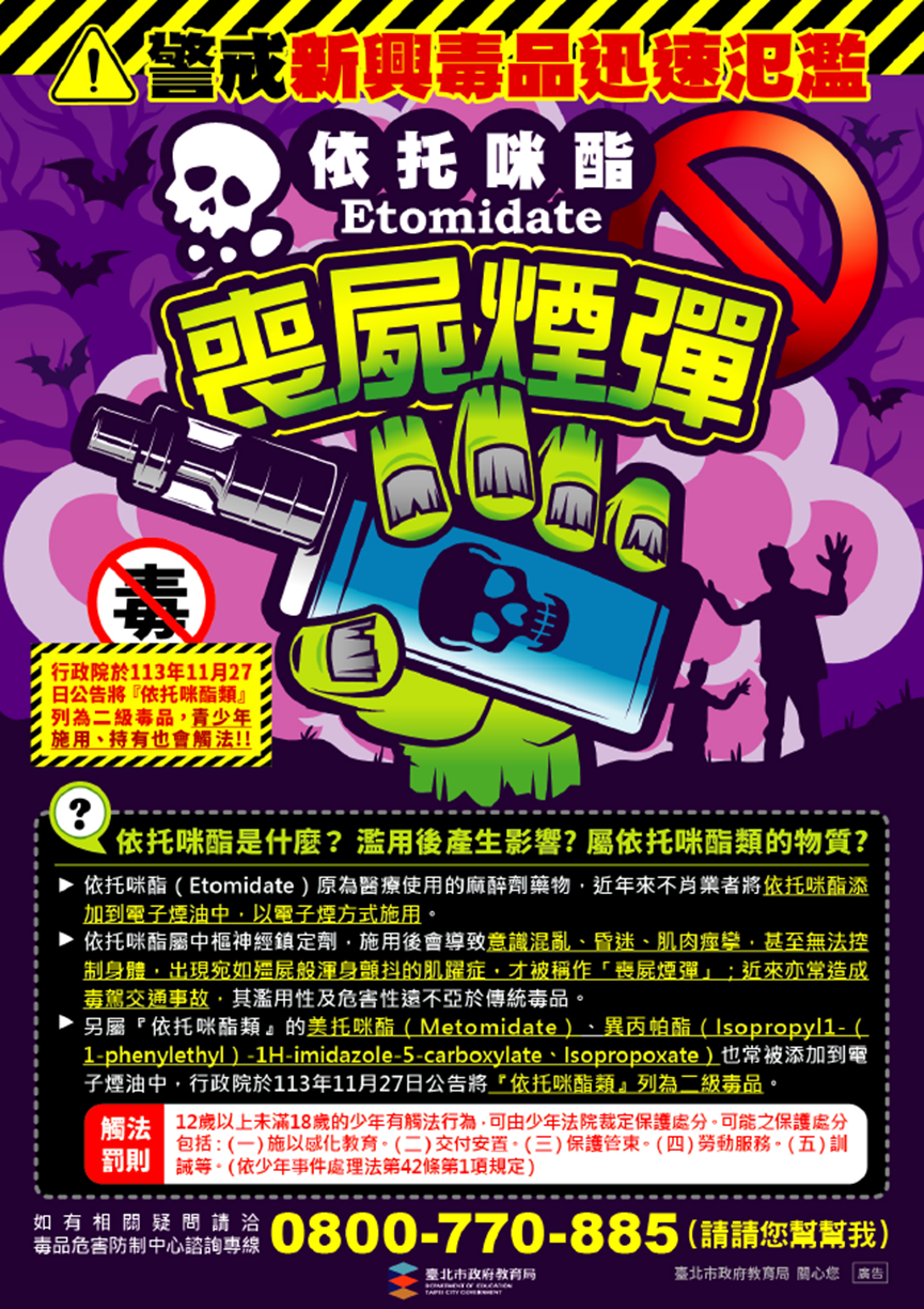 教育局推出針對依托咪酯類毒品的宣導電 子海報(EDM)向教師家長、學生提醒此毒品之危害及相關 罰則,以增強毒品防範意識。