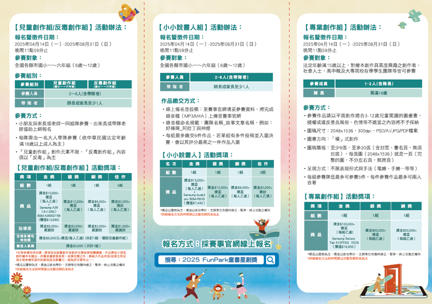 本賽事徵件期間自即日起至114年8月31日止,一律採網路 報名,報名網址:https://story.funpark.com.tw/。