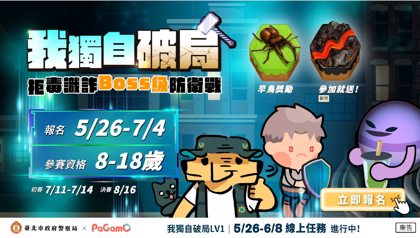 為強化兒少拒毒、識詐觀念,本府警察局114年(下同)結 合PaGamO遊戲化平臺推出「我獨自破局:拒毒識詐Boss級 防衛戰」 活動,