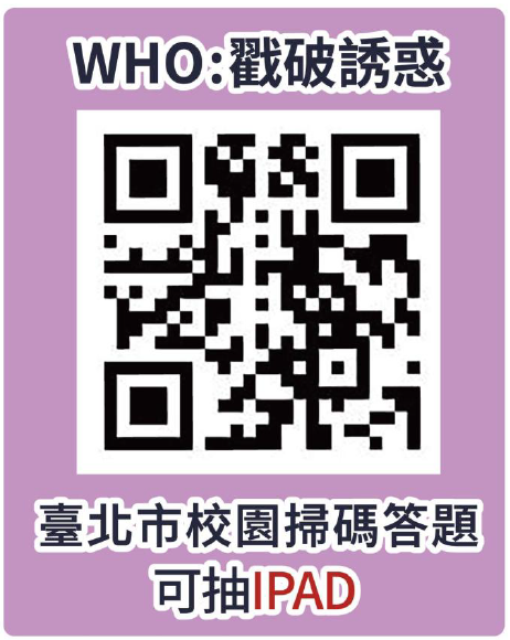 臺 北市衛生局、教育局與董氏基金會聯手,響應 2025年 WHO最新 「 揭露菸商 真面目 -戳破 菸品 誘惑」 主軸, 舉辦掃碼 答題抽獎 行 動。 透過 校園學生 答題 與國際菸害防制接軌 ,還有機會抽中 iPad和郵局現金禮券!