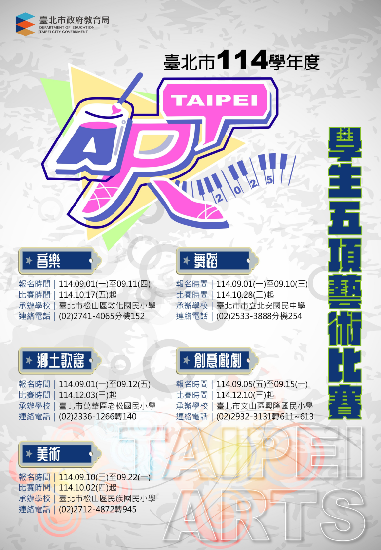 (1)音樂個人賽報名:114.09/01(一)~114.09.11(四),校內收報名表期限至9/12(五)16:00。