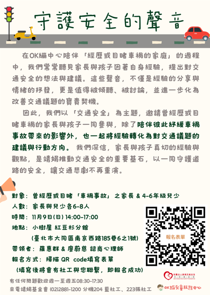 靖娟基金會OK繃兒童服務中心將於114年11月9日14時至17 時辦理以「交通安全」為主題之團體活動,