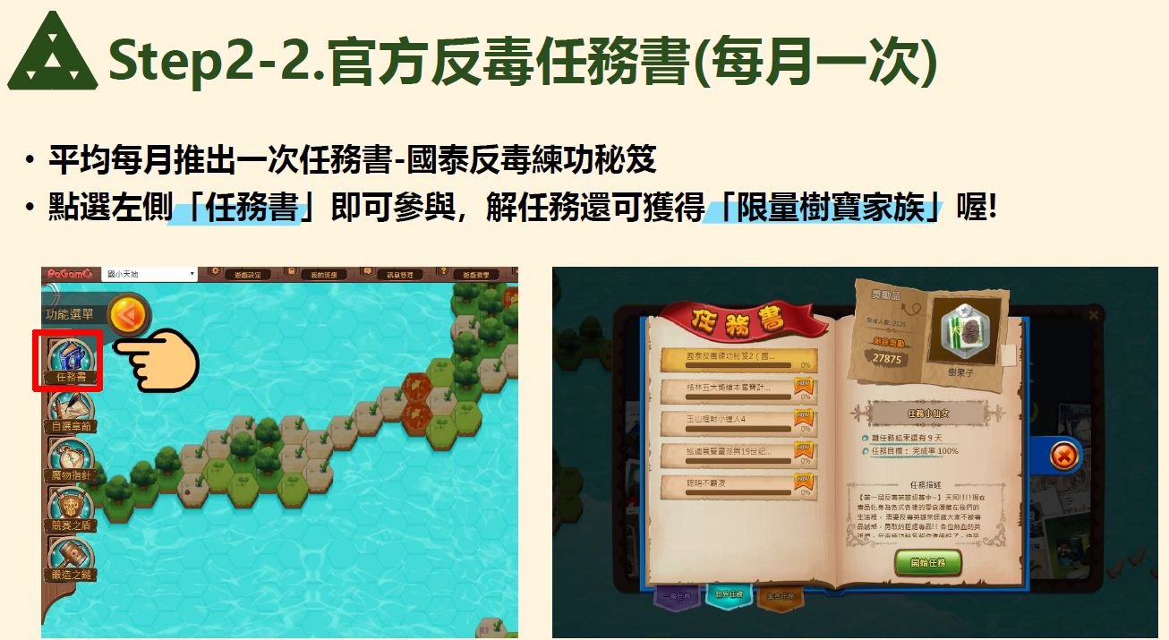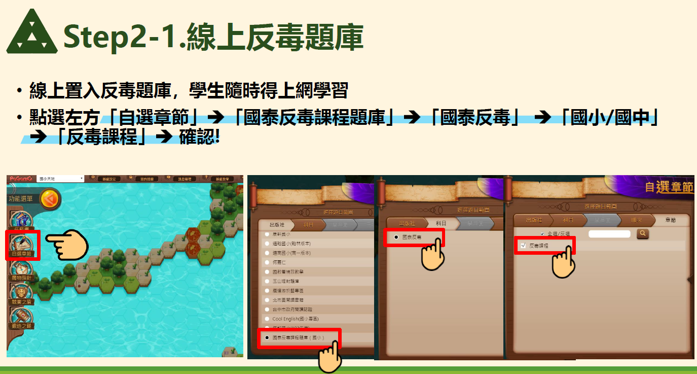 1、PaGamO線上學習:於「國中/小世界」置入反毒題庫與 任務。