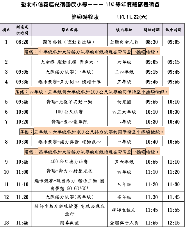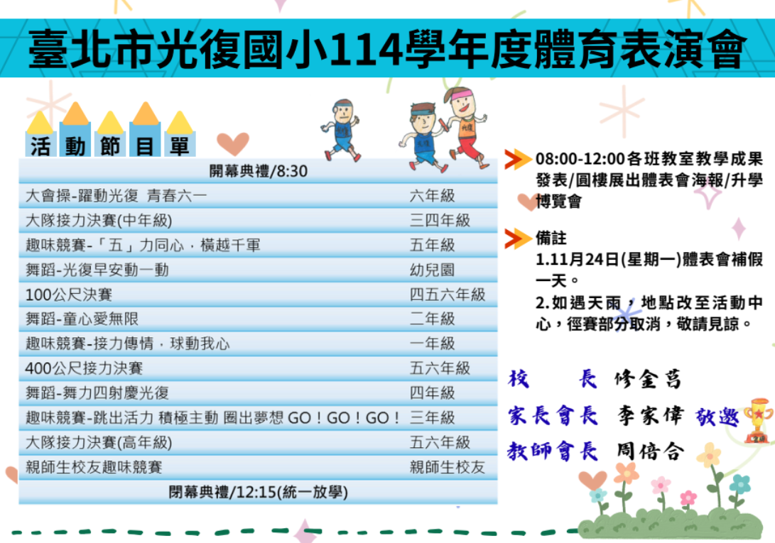 若活動提早結束,請於教室安排其餘教學活動至12:00,統一放學,家長若有事可先行帶學生離開。