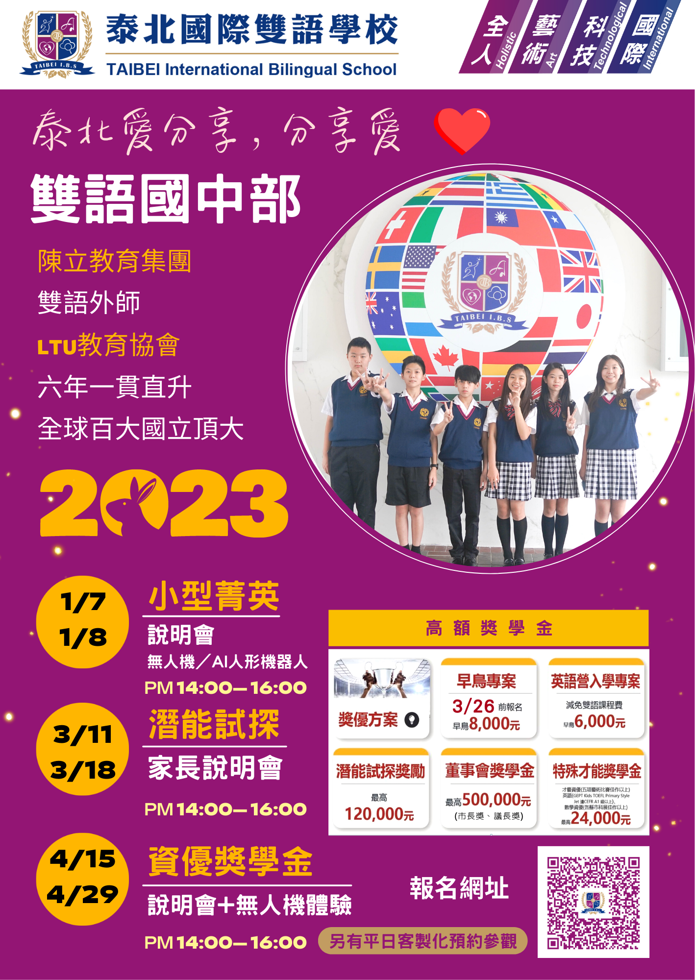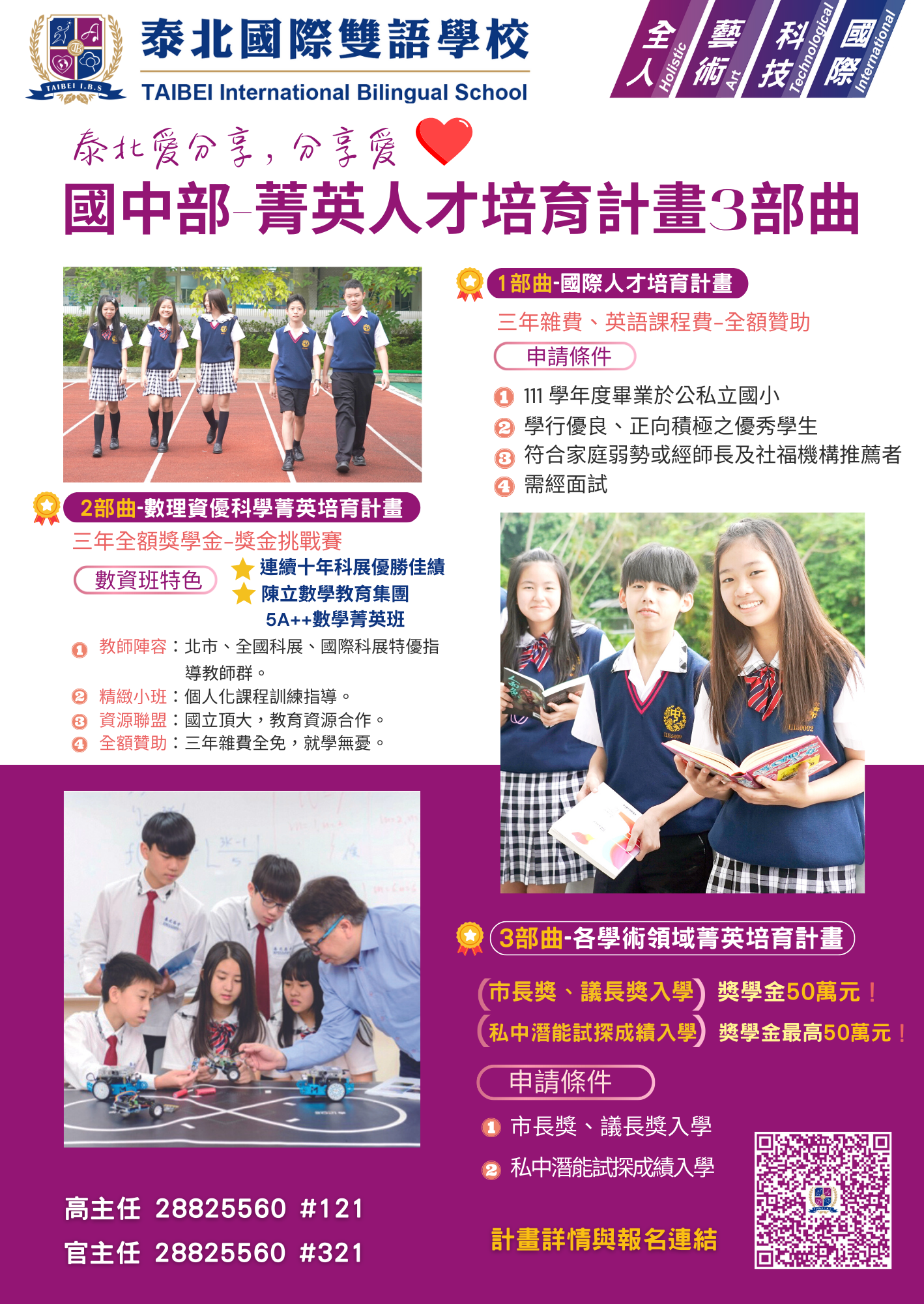 二、獎助內容:提供國中三年雜費、雙語課程費用全額獎學金。