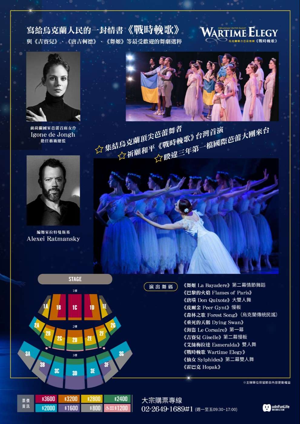 說明: 一、為拓展國人及學子們的藝文素養與舞蹈藝術之視野,本公 司引進被英國媒體盛讚為「這演出幾乎是個奇蹟」的烏克 蘭聯合芭蕾舞團(THE UNITED UKRAINIAN BALLET)演出 《天鵝湖》,然而,隨著烏俄戰爭僵持超過一周年,雙方 陣營對立局面愈顯嚴重,近日歐美各地都傳出停演俄國作 品的消息。為了避免造成不必要的誤解與困擾,烏克蘭聯 合芭蕾舞團決定全面停止演出由俄國作曲家完成的《天鵝 湖》,並帶來《戰時輓歌Wartime Elegy》、《吉賽兒》、 《唐吉軻德》、《舞姬》等最受歡迎的舞劇選粹。 二、「2023烏克蘭聯合芭蕾舞團《天鵝湖》」表演訊息如下: (一)表演時間:112年4月29日(周六)起至112年4月30日 檔 號: 保存年限: 9 光復國小 1120309 *TMAA1126001719* . . . . . . . . . . . . . . . . . . . . . . . . . . . . . . 裝 . . . . . . . . . . . . . . . . 訂 . . . . . . . . . . . . . . . . 線 . . . . . . . . . . . . . . . . . . . . . . . . . . . 第 2 頁,共 4 頁 (周日) (二)表演地點:台北流行音樂中心 (三)表演介紹:烏克蘭聯合芭蕾舞團(United Ukrainian Ballet)集結一群烏克蘭頂尖芭蕾舞者,他們來自於烏 克蘭各地劇院與舞團,因烏俄戰爭而流離失所,最後落 腳荷蘭海牙,在此重拾舞鞋,恢復日常的訓練,組成一 支職業舞團,在此作為烏克蘭芭蕾舞者的戰時庇護所。 2022年烏克蘭聯合芭蕾舞團陸續巡演英國、澳洲、新加 坡、美國等地,所到之處票券銷售一空,感動無數觀 眾,讓世人見證藝術撫慰人心的神奇力量。本次舞團將 帶來《戰時輓歌》、《吉賽兒》、《唐吉軻德》、《舞 姬》等最受歡迎的舞劇選粹。《戰時輓歌Wartime Elegy》是當代最重要的編舞家之一拉特曼斯基 (Alexei Ratmansky)在烏俄戰爭爆發後的全新創作, 但並未充滿政治訊息,相反地,他採用了烏克蘭當代最 知名作曲家西爾維斯特洛夫(Valentin Silvestrov)的 音樂,加上烏克蘭傳統歌曲,是拉特曼斯基寫給烏克蘭 人民的一封情書,向他們堅韌不拔的精神致敬,並祈禱 未來的和平。其他精采節目包括《舞姬La Bayadere》充 滿動感與異國風情的第二幕;以雙手關節展現不可思議 靈活度與生命力的《垂死的天鵝The Dying Swan》;挑 戰男女舞者技巧極限的《海盜 Le Corsaire》第一幕; 以及《唐吉軻德Don Quixote》的大雙人舞等,其32鞭轉 的難度完全不遜於黑天鵝在《天鵝湖》的高潮。此外, 舞團更特邀世界其他頂尖舞團的烏克蘭舞星,包括前馬林斯基首席Anastasia Matvienko與Denis Matvienko, 以及英國國家芭蕾的Katya Khaniukova等人加入客席陣 容,為台灣民眾帶來一場最精采的芭蕾盛宴,希望以藝 術感動人心,為這個紛擾的世界帶來光明與希望。 (四)演出舞碼: 1、《舞姬 La Bayadere》第二幕情節舞蹈 2、《巴黎的火焰 Flames of Paris》 3、《唐吉軻德 Don Quixote》大雙人舞 4、《皮爾金 Peer Gynt》慢板 5、《森林之歌 Forest Song》(烏克蘭傳統民謠) 6、《垂死的天鵝 Dying Swan》 7、《海盜 Le Corsaire》第一幕 8、《吉賽兒 Giselle》第二幕慢板 9、《艾絲梅拉達 Esmeralda》雙人舞 10、《戰時輓歌 Wartime Elegy》 11、《仙女 Sylphides》第二幕雙人舞 12、《霍巴克 Hopak》 三、購票優惠方案及票價: (一)校園專屬購票優惠方案:至4/19止,單筆訂購不限張 數,享88折,訂購4張(含)以上,享85折。適用1,600元 (含)以上票區。 (二)票價:3,600元 / 3,200元 / 2,800元 / 2,400元 / 2,000元 / 1,600元 (三)訂購連結:http://bit.ly/3XqcEKm 四、敬請惠予公告本表演相關訊息於貴單位。 五、檢送本活動EDM,呈請貴校員工、師生及家長踴躍參加。 六、本案聯絡單位:通路行銷中心 七、服務專線:(02)02-2649-1689#1。傳真:(02)8643- 3548