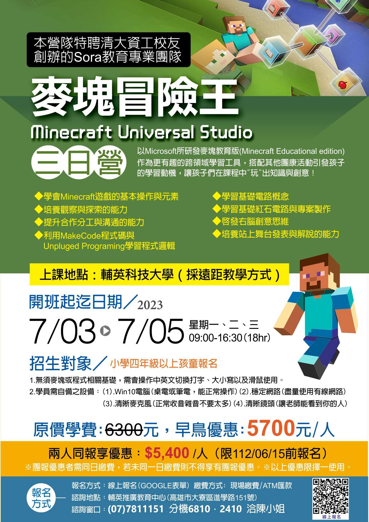 說明: 一、課程特色:以Microsoft所研發麥塊教育版(Minecraft Educational edition)作為更有趣的跨領域學習工具,搭 配其他團康活動引發孩子的學習動機,讓孩子們在課程中 『玩』出知識與創意 二、小學4年級以上孩童報名,無須麥塊或程式相關基礎,需會 操作中英文切換打字、大小寫以及滑鼠使用。 三、學員需自備之設備:Win10電腦(桌電或筆電,能正常操 作)、穩定網路(盡量使用有線網路)、清晰麥克風(正常收 音雜音不要太多)、清晰鏡頭 (讓老師能看到你的人)。 四、報名相關資訊: (一)課程時間:112年07月03日至112年07月05日(星期一、 二、三) 09:00 ~ 16:30(共計18小時) (二)上課地點:採遠距教學方式 (三)招生名額:30名,額滿截止。 (四)課程費用:各課程價格與相關內容詳情請參閱課程DM。 (五)報名方法:至本校推廣教育中心GOOGLE表單 (https://forms.gle/yBffFsRzDYJ7sQFG7),填寫報名資 料暨繳交課程費用即完成報名。 五、隨文檢附宣傳海報。 六、未盡事宜請逕向本校推廣教育中心陳小姐,電話07- 7811151分機2410、6810。