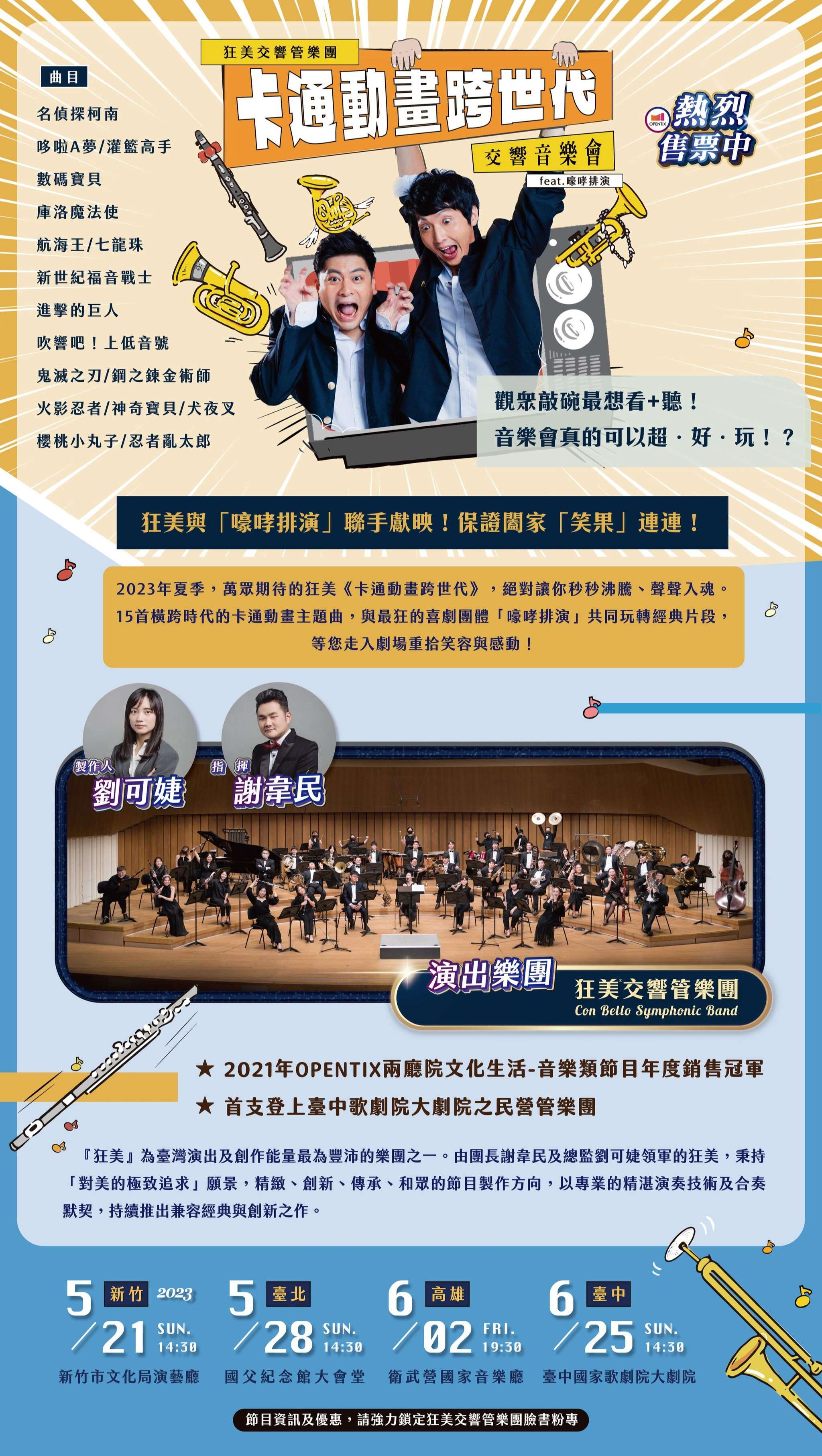 說明: 一、節目介紹:2023年盛夏,萬眾期待的狂美《卡通動畫跨世 代》精選多部話題度最高的動畫作品,從80年代起的七龍 珠、灌籃高手、名偵探柯南、神奇寶貝,到近代的航海 王、火影忍者、鬼滅之刃…等,並邀請最具創意的「嚎哮 排演」以多面向的戲劇表演、喜劇段子,復刻經典畫面和 劇情橋段,加上狂美詮釋的主題曲,讓您一次滿足所有想 像可能!絕對讓你秒秒沸騰、聲聲入魂。 二、演出時間及地點: (一)新竹-新竹市文化局演藝廳 05/21(日) 14:30 (二)臺北-國父紀念館大會堂 05/28(日) 14:30 (三)高雄-衛武營國家音樂廳 06/02(五) 19:30 (四)臺中-臺中國家歌劇院 06/25(日) 14:30 三、免費加入愛樂之友即可取得教育推廣75折購票優惠: https://line.me/R/ti/p/%40conbello2017 四、旨揭展演活動票價為新台幣400至1800元,購票請洽兩廳院 購票系統: https://s.opentix.life/p/P34ef9d1d 五、活動相關資訊請洽樂團臉書粉絲專頁: https://www. facebook.com/ConBello2017/