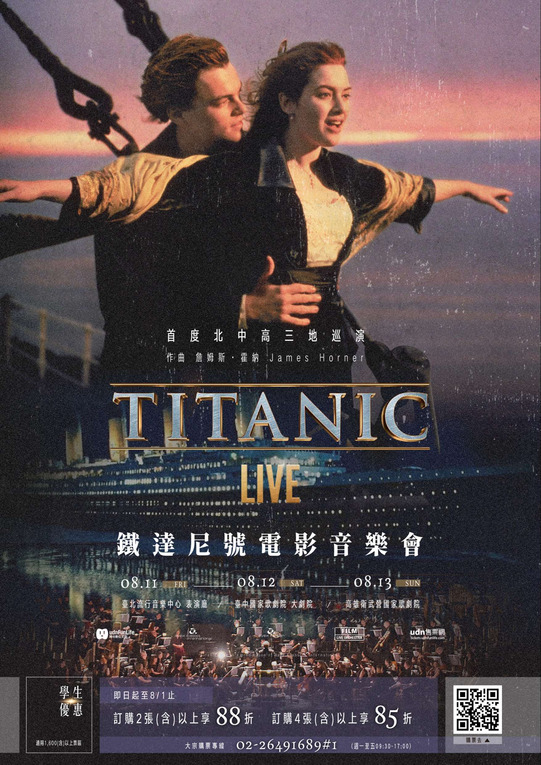 說明: 一、本公司致力將國際級演出節目帶到台灣,在2022年首次引 進於世界影史極具代表性且主題曲千年不墜的《鐵達尼號 電影音樂會》,獲得熱烈迴響,一票難求;為服務廣大喜 歡演出的朋友,也方便學生們就近欣賞,今年將首度於北 中南三地巡迴演出,其中台中、高雄更安排於國家級場館 演出。現場除能欣賞電影外,演奏部份將搭配百人編制管 絃樂團、合唱團,本次更特邀電影配樂中表現極為亮眼的 愛爾蘭風笛吹奏家Eric Rigler以及英國女高音Eleanor Grant等來台獻技,讓學子們身歷其境體驗這段具歷史意義 並風靡全球的愛情故事,有助於拓寬藝文視野及對於經典 影視作品的認識,並與世界接軌。 二、《鐵達尼號電影音樂會》節目訊息: (一)演出時間、地點: 1、2023/8/11(五),19:30,台北流行音樂中心表演廳。 2、2023/8/12(六),14:30、19:30,臺中國家歌劇院大劇 院。 3、2023/8/13(日),16:00,高雄衛武營國家歌劇院。 (二)節目介紹:跨越世代的經典電影《鐵達尼號》耗資上億 美元,是當時最昂貴的電影,為了真實還原歷史,導演 詹姆斯.卡麥隆 (James Cameron) 特地打造了1:1的模 型拍攝,同時採用最先進的電腦動畫技術,讓觀眾身歷 其境地參與歷史事件之中。上映總票房就超過18.4億美 元,是全世界首部突破10億美元大關的電影,盤據全球 影史賣座排行榜冠軍長達12年,目前仍高居第3名。《鐵 達尼號》在該年的奧斯卡獎也大放異彩,共獲得14項提 名,最終獲得11座獎項,包括最佳影片、最佳導演、最 佳攝影、最佳視覺效果、最佳原創音樂、最佳原創歌曲 等,同時還創下10項金氏世界紀錄:成本最高電影、票 房最高的劇情片等,在全球影史上的地位難以取代。 《鐵達尼號》配樂由傳奇好萊塢電影作曲家詹姆斯.霍 納James Horner一手打造,除獲得奧斯卡肯定外,亦獲 得3座葛萊美獎,並被認證為史上最暢銷的電影配樂專 輯。由席琳狄翁 (Celine Dion) 演唱的主題曲〈My Heart Will Go On〉更是傳唱大街小巷,是音樂史上最 暢銷單曲之一,在全球超過二十國排行榜登上冠軍。今 年8月將以超過百人的管絃樂團及合唱團編制現場演出,讓觀眾有如身歷其境的感受,當樂音響起時,與傑克和 蘿絲共同出航,體驗這具有歷史意義以及淒美愛情的航 行。演出時間預計215分鐘,含中場休息20分鐘。 (三)演出人員介紹: 1、《愛爾蘭風笛手 - Eric Rigler》:Eric Rigler為著 名的美國愛爾蘭風笛獨奏家,一生致力於愛爾蘭風 笛、蘇格蘭風笛以及高音哨笛,也被譽為是有史以來 出版最多唱片的風笛家。他的演奏出現在多個電影以 及電視劇當中,包括《鐵達尼號》、《埃及王子》、 《梅爾奇勃遜之英雄本色》、《怒海爭鋒:極地征 伐》、《登峰造擊》、《MIB星際戰警3》等。除此之 外,曾與披頭四成員保羅.麥卡尼 (Paul McCartney)、芭芭拉.史翠珊 (Barbra Streisand)、 惠妮.休斯頓 (Whitney Houston)、瑪麗亞.凱莉 (Mariah Carey) 等著名歌手合作。 2、《女高音獨唱 - Eleanor Grant》:Eleanor Grant為 英國的歌手,在倫敦皇家音樂學院以一級榮譽的優異 成績畢業。曾與BBC交響樂團、英國皇家愛樂樂團、英 國國家歌劇院等著名樂團共同演出,並曾演出多部音 樂劇,包含《Into the Woods》、《Aladdin》、 《Urinetown》、《The Last Five Years》。她於倫 敦皇家艾伯特音樂廳 (Royal Albert Hall) 以及上 海、盧森堡擔任《英倫情人》電影音樂會獨唱,也曾 在法國擔任《鐵達尼號》電影音樂會獨唱,並於 2019、2022受邀到 Hollywood in Vienna 年度電影音 樂盛會演唱。 3、《指揮 - 呂景民》:指揮家呂景民,曾在瑪塔國際指 揮大賽 (The Eduardo Mata International Conducting Competition) 等比賽中獲勝,也是2003 年奧地利政府所頒發「藝術成就獎」 (Würdigungspreis) 的獲獎者。曾指揮歐、亞、美、 非洲多國交響樂團,包括維也納廣播交響樂團 (Radio Symphony Orchestra Vienna)、布達佩斯節慶 管絃樂團 (Budapest Festival Orchestra)、斯洛伐 克愛樂交響樂團 (Slovak Philharmonic Orchestra)、立陶宛國家交響樂團 (Lithuanian National Symphony Orchestra)、索菲亞節慶管絃樂 團 (Sofia Festival Orchestra)等知名歐洲樂團。除 了指揮上的優異成就,呂景民亦熟稔於各項大型演出 計畫執行與推動。近年更多方嘗試跨領域藝術展演, 製作「舞春」、「臺南藝術節」、「月津港燈節水上 音樂會」、「TASO互動式親子音樂會」、「TASO名人 音樂廳」、「TASO不靠譜俱樂部」等跨領域展演,並 接受政府單位委託製作各項音樂節目、國際文化交流 各項大型計畫。 4、《樂團 & 合唱團 -TASO 台灣藝術家交響樂團暨合唱 團》:每個時代應該有自己展現音樂的形式,這個最 具創意的樂團,正以其驚人的能量,與您一同TASO(探索)、並重新定義這個時代音樂展演的可能! TASO不斷開創新的展演形式,至今已擁有專為親子打 造的「TASO互動式親子音樂會」系列、專為年輕人發 展的「TASO不靠譜俱樂部」系列、為所有觀眾設計的 「TASO名人音樂廳」系列,以及即將推出跨越時空的 「TASO探索音樂廳」系列,四大系列,不只精彩,更 令人耳目一新! 三、購票優惠方案及票價:(因有部分裸露畫面,建議13歲以上 觀眾入場觀賞,6至12歲請由家長陪同。) (一)校園專屬購票優惠方案:至8/1(二)止,單筆訂購2張 (含)以上,享88折,4張(含)以上,享85折。優惠僅適用 1,600元(含)以上票區。 (二)票價: 1、台北場:3,800元 / 3,200元 / 2,800元 / 2,200元 / 1,600元。 2、台中/高雄場: 4,000元 / 3,600元 / 3,200元 / 2,800