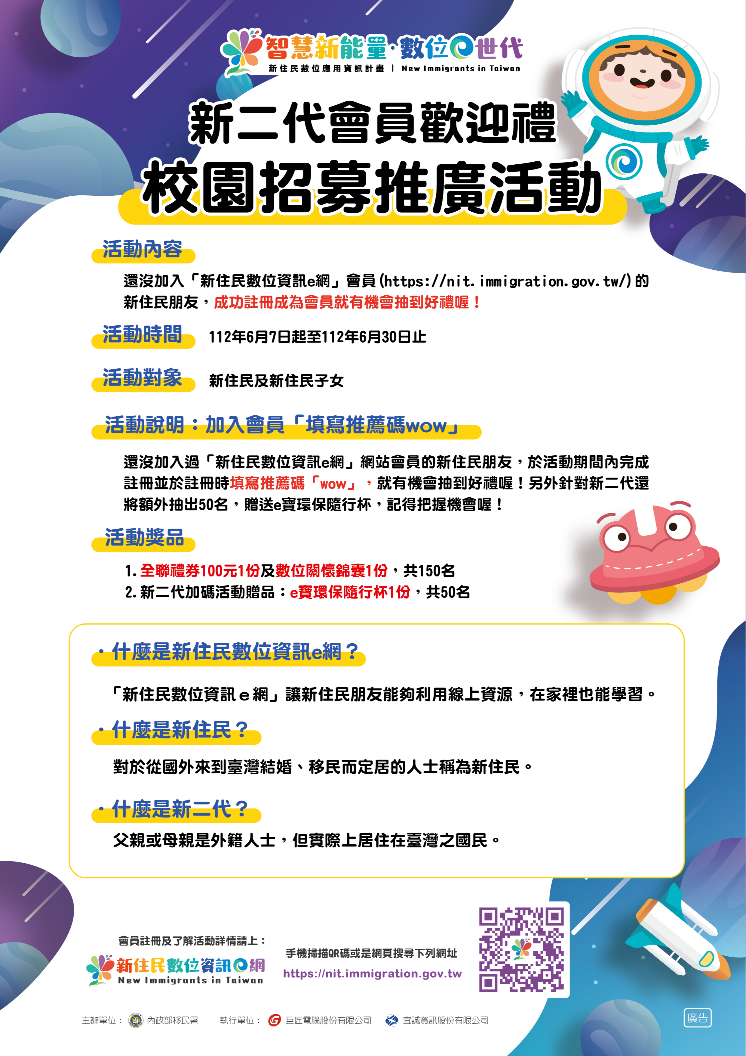 三、為廣邀校園之新住民及新住民子女踴躍參與學習,該署特 舉辦「新二代會員歡迎禮~園招募推廣活動」新會員註冊推 廣活動,活動期間自112年6月7日至112年6月30日止,活動 詳情請參閱新住民數位資訊e網公布欄。若有相關疑問,請撥打計畫免費服務專線:0800- 005-788。
