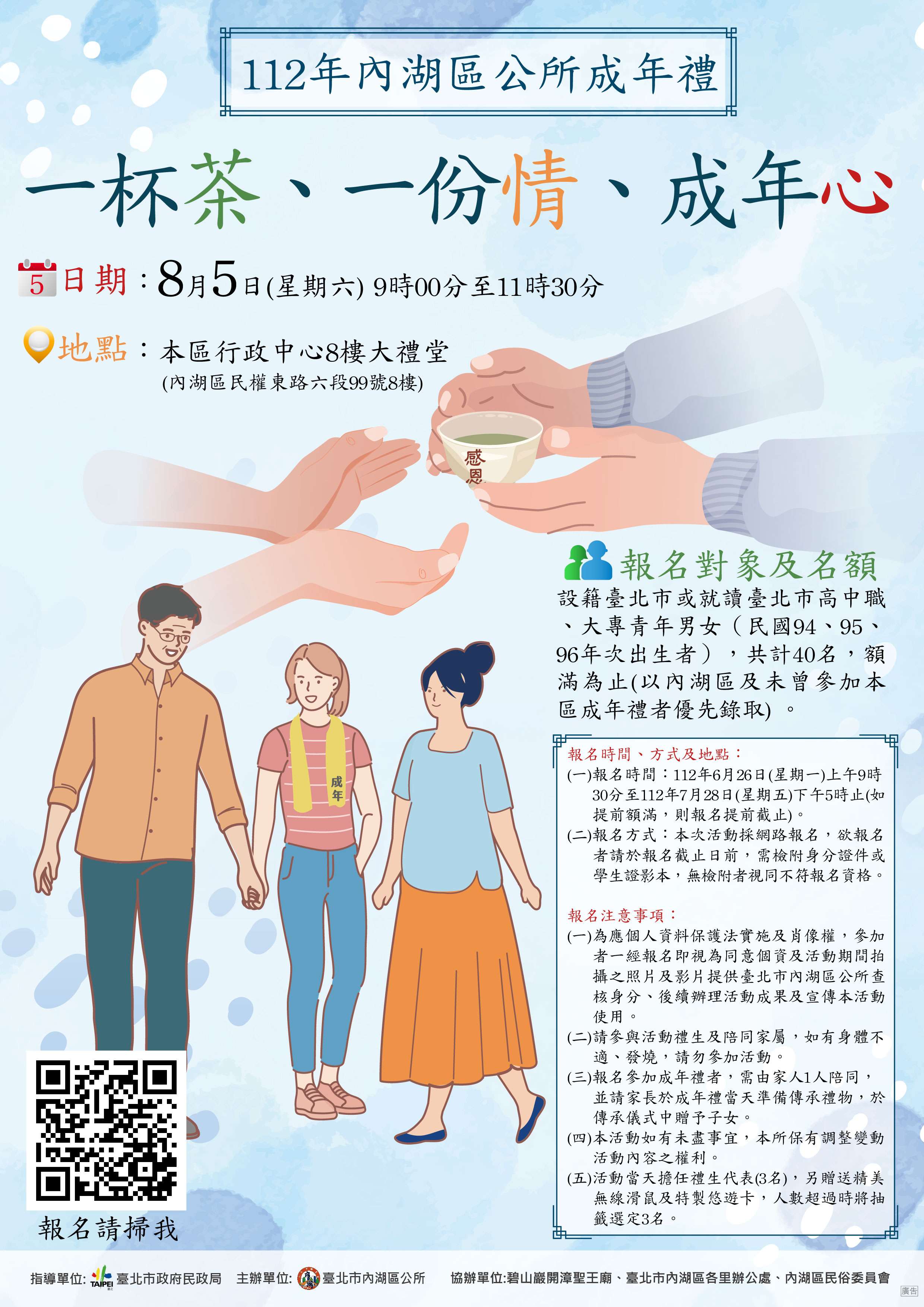 說明: 一、請貴單位自即日起至7月28日止運用所屬管道協助宣傳,至 紉公誼。 二、宣導文稿如下,請參酌使用:「臺北市內湖區公所112年度 成年禮活動,訂於8月5日(星期六)上午9時舉辦,凡成功 報名並全程參與之禮生,可獲得成年禮紀念郵票、智慧 巾、茶具組及禮券600元各1份。活動內容包含茶道文化體 驗、穿越智慧門、行感恩禮及成年禮專屬拍貼機,即日起 開放報名,歡迎設籍或就讀於臺北市之青年男女(民國94 至96年次)踴躍報名參加,內容豐富,精彩可期。」 三、活動詳情,請參閱活動海報及簡章或洽詢(02)27925828轉 605人文課洪小姐。