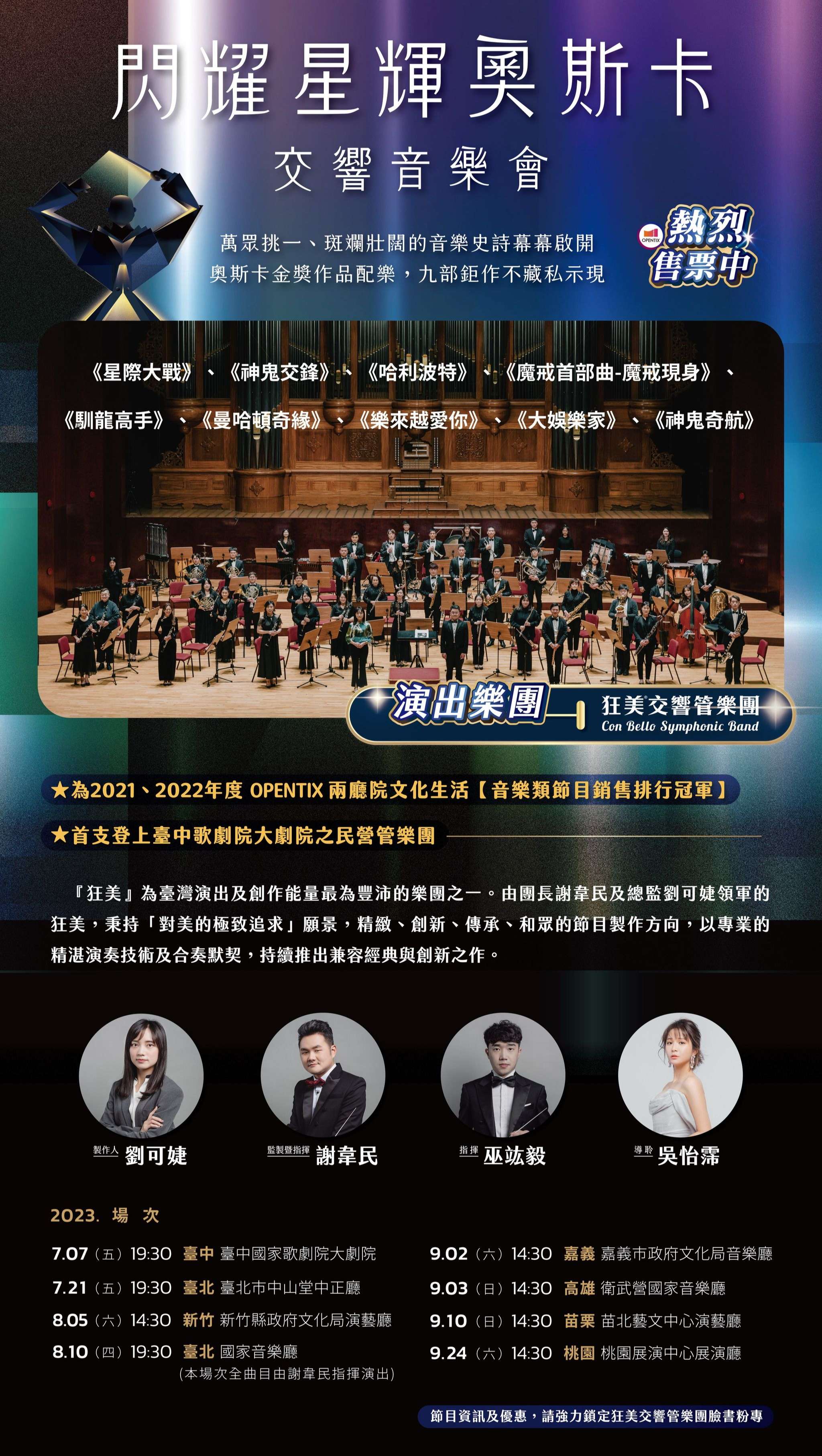說明: 一、節目介紹:字裡行間有詩、弦律跌宕亦如詩。電影,是諸 多畫面的層層堆砌。盛夏,狂美將從萬千奧斯卡電影提名 與得獎作品中,揀選不同元素,與導聆吳怡霈以樂章協力 呈現九部電影史詩的壯闊恢弘。最終將邀請觀眾擔任評 委,「投票」選出本場最佳演繹,你我都是盛典要員,聽 覺與互動交織的音樂會,不容錯過。 二、演出時間及地點: (一)臺中-臺中國家歌劇院大劇院 07/07(五) (二)臺北-臺北市中山堂中正廳 07/21(五) (三)新竹-新竹縣政府文化局音樂廳 08/05(六) (四)臺北-國家音樂廳 08/10(四) (五)嘉義-嘉義市政府文化局音樂廳 09/02(六) (六)高雄-衛武營國家音樂院 09/03(日) (七)苗栗-苗北藝文中心演藝廳 09/10(日) (八)桃園-桃園展演中心展演廳 09/24(日) 三、免費加入愛樂之友即可取得教育推廣75折購票優惠: https://line.me/R/ti/p/%40conbello2017 四、旨揭展演活動票價為新台幣400至1800元,購票請洽兩廳院 購票系統: https://s.opentix.life/p/P1d74d9b7 五、活動相關資訊請洽樂團臉書粉絲專頁: https://www. facebook.com/ConBello2017/
