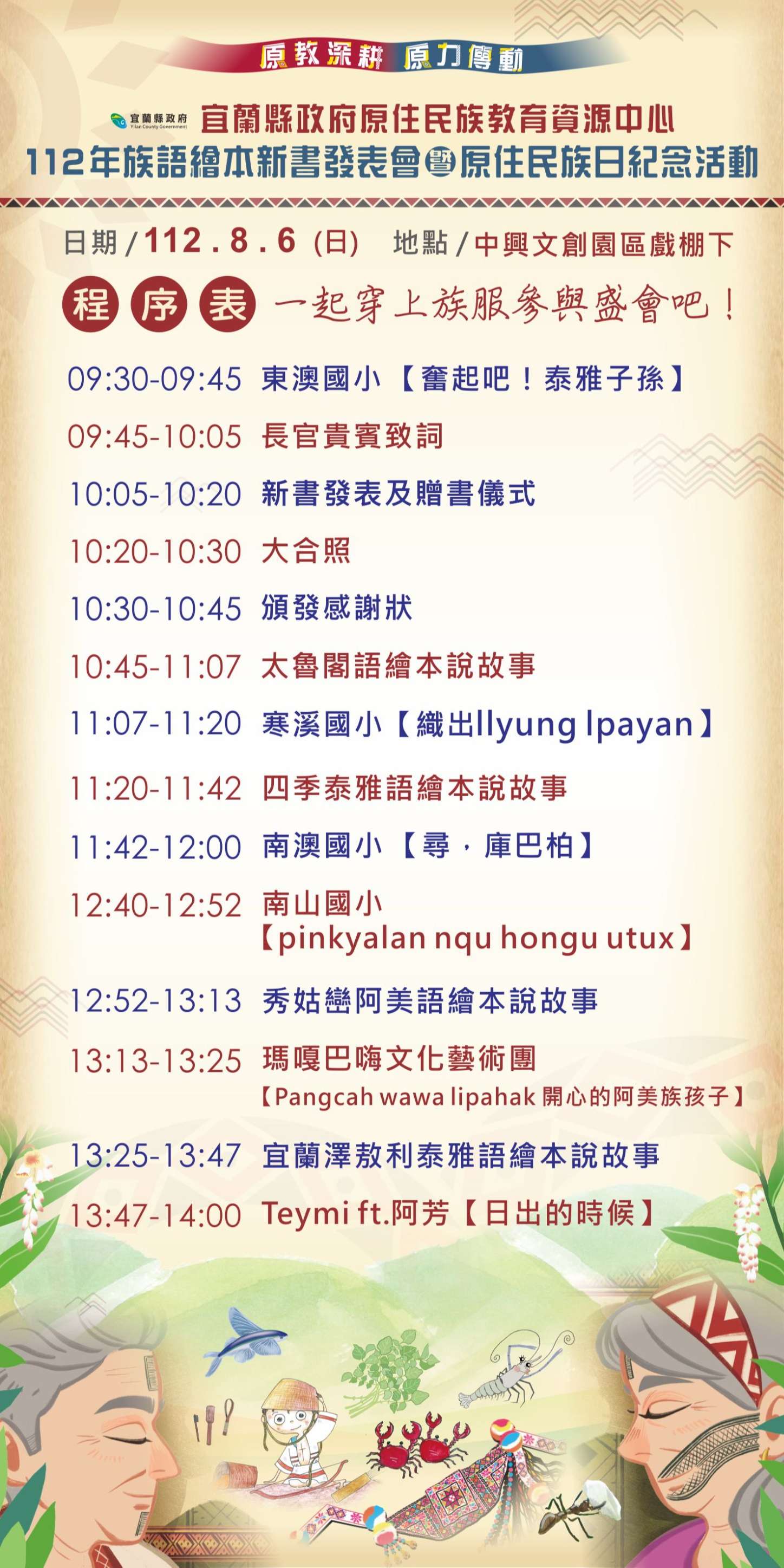 二、相關資訊如下:(一)辦理日期:112年8月6日(星期日)上午9時至下午2時30分。(二)辦理地點:宜蘭中興文化創意園區戲棚下(宜蘭縣五結鄉中正路二段6之8號)。(三)檢附實施計畫及活動海報各1份。