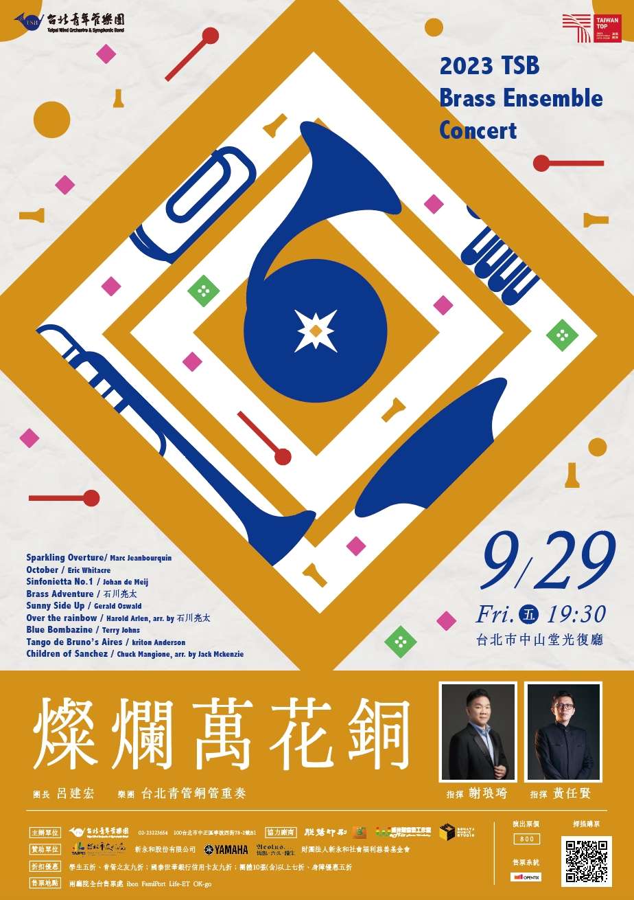 說明: 一、2023台北青管重奏音樂會,由謝琅琦、黃任賢老師指揮, 率領台北青管銅管與打擊團員,演出包羅萬象銅管重奏樂 曲,為難得一見的精緻演出。 二、旨揭音樂會相關訊息如下: (一)演出時間:112年9月29日(星期五)晚上7:30。 (二)演出地點:臺北市中山堂光復廳(臺北市中正區延平南 路98號)。 (三)學生購票5折,其餘折扣優惠查詢請至兩廳院售票系統 (http://0rz.tw/MGYhK);相關問題請逕洽台北青管樂 團經理王先生(02-23223654)。 (四)相關音樂會資訊請至台北青年管樂團臉書粉絲專頁查詢 (http://www.facebook.com/tsbgroup)。 三、檢附旨揭音樂會海報供參。