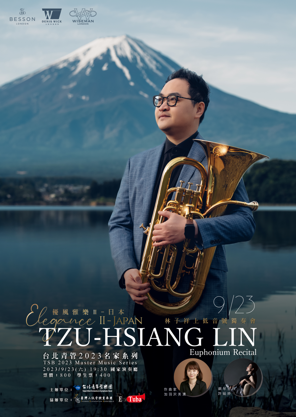 說明: 一、2023台北青管名家系列,本次規畫邀請台北青管上低音號 首席林子祥老師,攜手鋼琴合作名家許毓婷老師,精選多 首日本樂曲與委託創作,呈現日式風格華麗炫技與銅管美 聲。 二、旨揭音樂會相關訊息如下: (一)演出時間:112年9月23日(星期六)晚上7:30。 (二)演出地點:臺北市國家演奏廳(臺北市中山南路21-1號 B1) (三)學生購票5折,其餘折扣優惠查詢請至兩廳院售票系統 (http://0rz.tw/nD9VP);相關問題請逕洽台北青管樂 團經理王先生(02-23223654)。 (四)相關音樂會資訊台北青年管樂團臉書粉絲專頁查詢 (http://www.facebook.com/tsbgroup)。三、檢附旨揭音樂會海報供參
