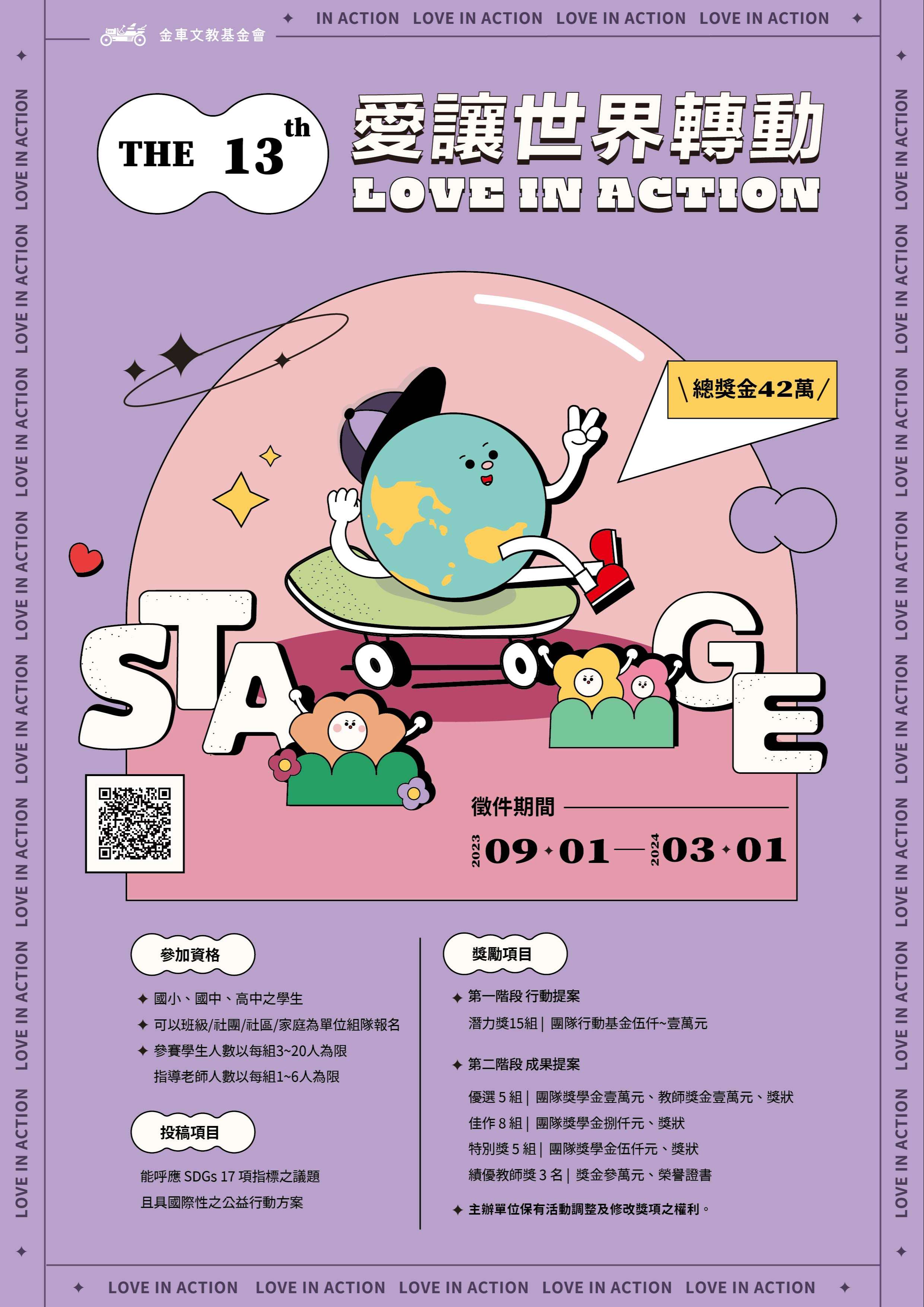 說明: 一、本會自2011年開始舉辦「愛讓世界轉動 兒少公益行動」徵 選,多年來累積超過萬名來自全台各地師生踴躍參與,以 STAGE行動步驟讓孩子走進世界舞台,學習發現問題、付諸 行動、發揮愛心並能收穫成長。 二、第13屆「愛讓世界轉動 兒少公益行動」徵選資訊 (一)活動報名:本屆徵選分為「行動提案」和「成果提案」 兩階段進行。 1、行動提案:2023年9月1日 至 2023年10月13日止 2、成果提案:2023年11月1日 至 2024年3月1日止 (二)活動對象:國小、國中、高中之學生,團隊學生人數以 3~20人為限。 (三)組隊資格:以班級、社區、家庭為單位報名。 (四)投稿主題:能呼應SDGs 17項指標之議題,且具國際性之 公益行動方案。 (五)活動獎項:主辦單位可視收件組數保留活動調整及修改 獎項之權利。 1、「行動提案」:潛力獎15組/行動基金5,000~10,000 元。 2、「成果提案」:優選5組/獎金20,000元、佳作8組/獎 金8,000元、特獎8組/獎金8,000元、績優教師獎3名/ 獎金30,000元。 (六)徵件詳情:請上本會官網:https://kingcar.org.tw/ 》我要報名》愛讓世界轉動 (七)活動聯絡:余亞蘭;電話02-2100-1110分機205;傳真 02-2100-1185;信箱/lynn@kingcar.org.tw。