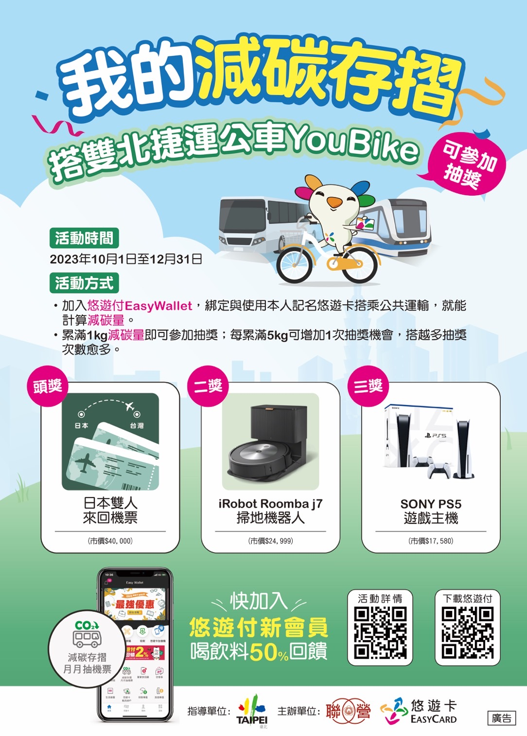 為攜手市民多使用公共運輸,以朝淨零排碳目標前進,本 府偕同臺北市公車聯營管理委員會與悠遊卡股份有限公司 舉辦旨揭抽獎活動。 三、上開活動於112年10月1日至112年12月31日止,只要加入 「悠遊付Easy Wallet」APP會員,綁定與使用本人記名悠遊卡,搭乘雙北公共交通運具(公車、捷運、輕軌及 YouBike)就能計算減碳量。累計滿1kg減碳量即可獲得當 月抽獎資格1次,每累計滿5kg,可再增加1次抽獎機會,累 計滿10kg則多2次,以此類推,搭乘公共運輸越多,就有越 多中獎機會。