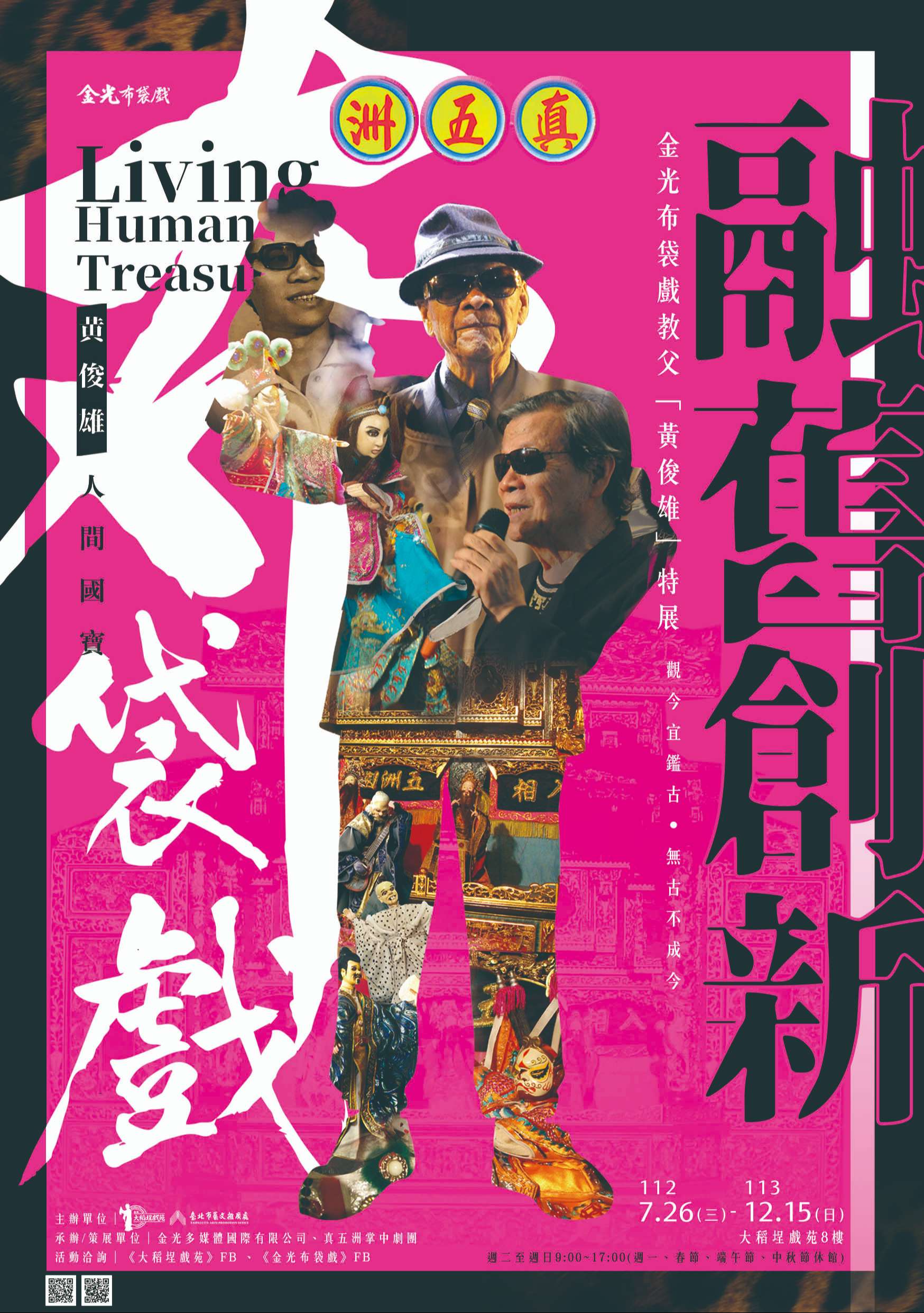 說明: 一、本特展以金光布袋戲教父「黃俊雄」傳承與創新布袋戲的 脈絡為主,展出其劇本手稿、蒐藏文物、作品精華片段以 及三代同堂口白傳承的珍貴影像記錄,讓參觀民眾了解其 生平事蹟,更可一窺臺灣傳統藝術-布袋戲,一路以來的 成長與變化;此外,展場更搭設主題實景重現招牌主角史 艷文、藏鏡人、黑白郎君經典決戰時刻,同時《金光布袋 戲》高人氣角色,如俏如來、戮世摩羅、雪山銀燕...... 等,亦於展覽期間現身大稻埕戲苑與民眾見面。 二、展覽資訊如下: (一)主辦單位:臺北市藝文推廣處 (二)承辦及策展單位:金光多媒體國際有限公司、真五洲掌 中劇團 (三)展覽時間:即日起至113年12月15日止,每週二至週日上午9時至下午5時(週一、春節、端午節、中秋節休 館)。 (四)展覽地點:大稻埕戲苑8樓特展區(臺北市迪化街1段21 號8樓)。 (五)費用:免費參觀。 三、檢附特展活動DM電子檔1份。 四、詳情請見「大稻埕戲苑」FB粉絲專頁、《金光布袋戲》FB 粉絲專頁。或洽詢大稻埕戲苑承辦人:梁小姐,電話02- 25569101轉215、E-mail:xc0462@gov.taipei。