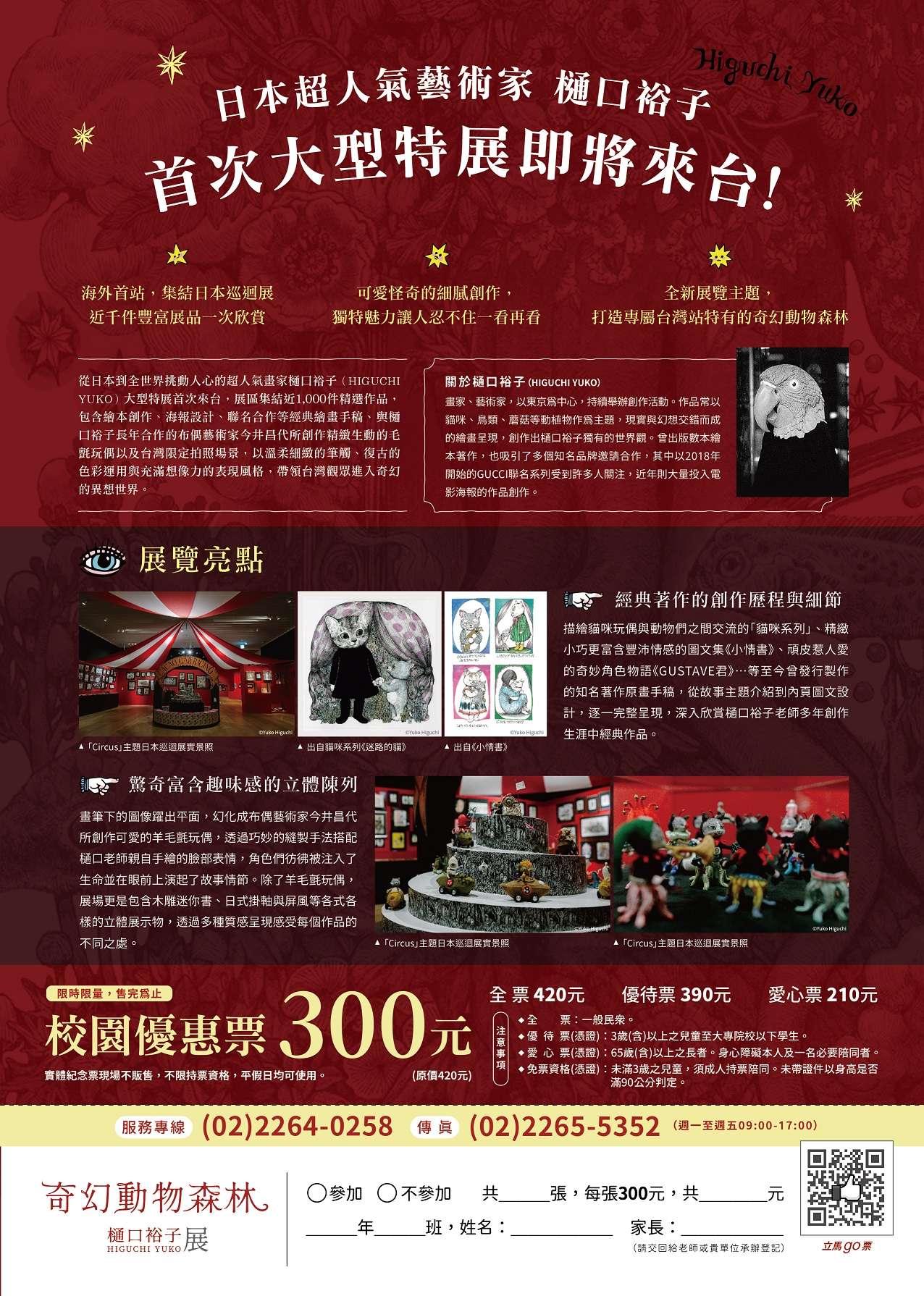 說明: 一、關於樋口裕子(Higuchi Yuko):你不能不認識!連GUCCI 都慕名前來合作的超人氣畫家、藝術家,以東京為中心, 持續舉辦創作活動,作品常以貓咪、鳥類、蘑菇等動植物 作為主題,結合復古的色彩運用,現實與幻想交錯而成的 繪畫風格,創造充滿異想色彩的迷人之作,獨特魅力讓人 忍不住一看再看。曾出版繪本「貓咪」系列:《世界上最 棒的貓》我們都是最獨特的自己、《沒人要的貓》也許悲 傷的事不一定不好、《開書店的貓》每個相遇都有其意 義、小巧卻富含豐沛情感的圖文集《小情書》、頑皮惹人 愛的奇妙角色物語《GUSTAVE君》、溫暖首部繪本作品《迷 路的貓》…數本經典著作,溫柔細緻的筆觸,治癒了許多 人的心。二、樋口裕子首次海外大型個展即將來台!展區集結近千件精 選作品,包含繪本創作、海報設計、聯名合作等經典繪畫 手稿逐一完整呈現,深入欣賞其多年創作生涯中經典作 品,還有長年合作的布偶藝術家今井昌代(Imai Masayo) 所創作精緻生動的毛氈玩偶以及台灣限定拍照場景,帶領 台灣民眾進入奇幻的異想世界。 三、藝術家樋口裕子特別為台灣展覽打造專屬主題「奇幻動物 森林」的獨特風格,將台灣特有氣候下所生長的植物、台 灣人的性格、台灣傳統花卉圖案等印象,融入於主視覺及 限定票券設計當中。展覽將可帶領學生了解不同文化之間 共通之處,通過藝術作品理解日本和台灣之間的文化交流 和聯繫,樋口裕子充滿創意和幻想的畫風,可激發學生的 創造力並培養藝術鑑賞能力,學習如何評價藝術作品,理 解畫家的技巧和藝術風格,以及藝術品背後的意義和情 感。 四、「奇幻動物森林樋口裕子展」訊息如下: (一)展覽期間:112年12月30日~113年4月7日 (二)營業時間:10:00~18:00(17:30停止售票及入場) (三)展覽地點:中正紀念堂2、3展廳。 五、展覽亮點: (一)海外首站,集結日本巡迴展近千件豐富展品一次欣賞。 (二)可愛怪奇的細膩創作,獨特魅力讓人忍不住一看再看。 (三)全新展覽主題,打造專屬台灣站特有的奇幻動物森林。 六、票價: (一)學校預售票,不分大人、小孩皆為300元,平、假日均可使用。 (二)現場票價: 1、全票420元:一般身分者適用。 2、優待票:390元。 (1)●持本國籍學生證件之在學學生,以當學期註冊章 為憑,入場需驗證,每證限購一張(碩博士學生 證、社區大學、空中大學及在職進修不適用)。 (2)●年齡3歲(含)以上,或身高超過90公分之幼 童。 七、敬請惠予公告本展覽相關訊息於貴單位。 八、檢送本活動海報、電子文宣正、反面、訂購單,呈請貴校 員工、師生及家長踴躍參加。 九、本案聯絡人:活動推廣部。校園優惠票服務專線(02) 2264-0258(代表號)。傳真:(02)2265-5352。