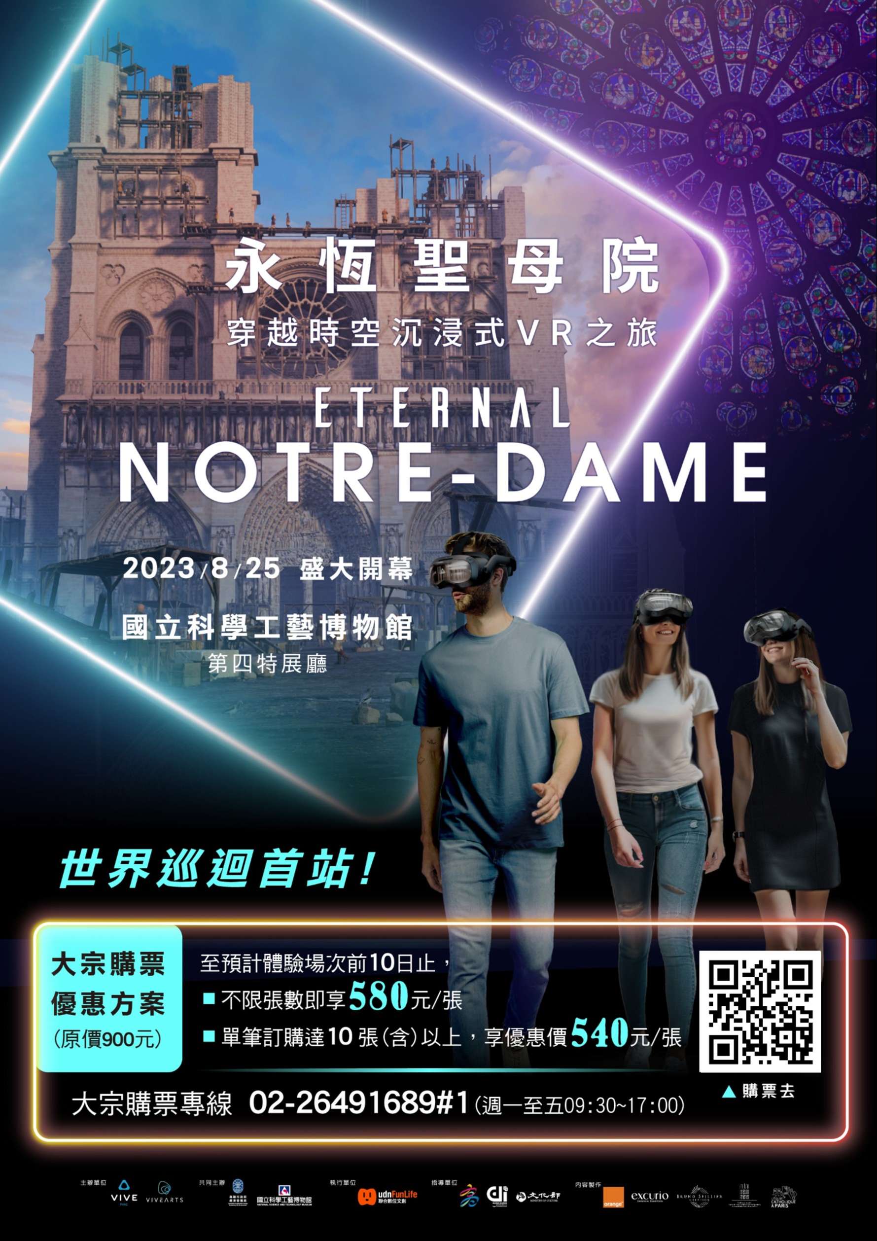 說明: 一、法國指標性的哥德式建築,同時也是寶貴的文化藝術資產 「巴黎聖母院」於2019年4月慘遭祝融,重建計畫受到全球 矚目及支持,除了建築本身的修建外,法國電信商Orange 與天主教巴黎總教區、巴黎市政府合作打造以融合VR科技 的沉浸式體驗《永恆聖母院》來重現巴黎聖母院的歷史與 藝術價值,也被視為科技復興世界文化遺產的重要里程 碑。如此別具歷史意義的VR體驗在HTC、VIVE Arts策畫、 本公司執行的共同合作下,引進台灣作為海外巡迴首站。 《永恆聖母院》是一趟穿越時空的沉浸式數位旅行,觀眾 來到《永恆聖母院》的展覽現場,建立一個虛擬分身之 後,僅須配戴VR頭顯裝置及背包,就可以在虛擬導遊的引領下,飛越國界直達法國,重回十二世紀巴黎聖母院開始 建造的最初時刻。深入建築內部,以360度全方位近距離觀 賞末日審判之門、祭壇、拱頂、玫瑰花窗、管風琴等精湛 絕美的建築元素;最後跟著升降梯登上69公尺高的鐘塔, 在巨鐘的底下感受多具銅鐘齊響的震撼。還能走出塔樓到 戶外,以絕佳的視野俯瞰瞭望大文豪雨果筆下的巴黎世 界,並重回2019年燒毀前屋頂尖塔的火災現場,向世人展 示正如火如荼進行中的修復計畫。全長共45分鐘的VR走動 式體驗,《永恆聖母院》將提供學生們一個既有趣又教育 性的嶄新體驗,有助於拓寬國際藝文視野及對於元宇宙、 虛擬實境科技的認識。 二、「永恆聖母院」展覽訊息: (一)展覽時間:112年8月25日(五)起至113年3月31日 (日) (二)展覽地點:高雄市 國立科學工藝博物館第四展廳 (三)節目簡介:從八百多年前巴黎聖母院建造初期的中世紀 作坊開始,「永恆聖母院」運用最新的獨特場域定位追 蹤技術、大場域空間走動式VR體驗,帶領觀眾穿梭不同 時代的巴黎聖母院,沉浸於這座偉大教堂豐富的歷史與 藝術寶藏中,重新發掘各種不為人知的祕密。 (四)節目亮點: 1、獨家視角,穿梭從未公開的建築內部,揭曉巴黎聖母 院的建築秘密 2、2.5K高解析度,獨特技術場域定位追蹤技術,大場域 空間走動式VR體驗3、全新互動式元宇宙,揪團多人連線共遊 4、歷時二年重金打造,虛擬實境重建巴黎聖母院的迷人 丰采 5、回到過去,親臨巴黎聖母院的重要歷史事件現場 6、2022年巴黎開展,海外巡迴首站高雄登場 三、票價、場次及購票優惠方案: (一)每日場次表 1、第1場09:00~10:00 2、第2場09:30~10:30 3、第3場10:00~11:00 4、第4場10:30~11:30 5、第5場11:00~12:00 6、第6場11:30~12:30 7、第7場12:00~13:00 8、第8場12:30~13:30 9、第9場13:00~14:00 10、第10場13:30~14:30 11、第11場14:00~15:00 12、第12場14:30~15:30 13、第13場15:00~16:00 14、第14場15:30~16:30 15、第15場16:00~17:00 (二)團體大宗購票優惠方案(全票原價900元) (三)至預計體驗場次前10日止,訂購不限張數,享優惠價580 元/張。單筆訂購10張(含)以上,享優惠價540元/張(四)訂購連結(教育團體專用):https://bit.ly/3sDFDji 四、敬請惠予公告本表演相關訊息於貴單位,同步檢送本活動 EDM,呈請貴校師生及家長踴躍參加。 五、本案聯絡單位:通路行銷中心服務專線(02)02-2649- 1689#1(周一至五09:30~17:00),若您有意參與教師研習營 活動,請填寫以下連結表單,以利後續通知相關資訊: https://bit.ly/45NrAp0