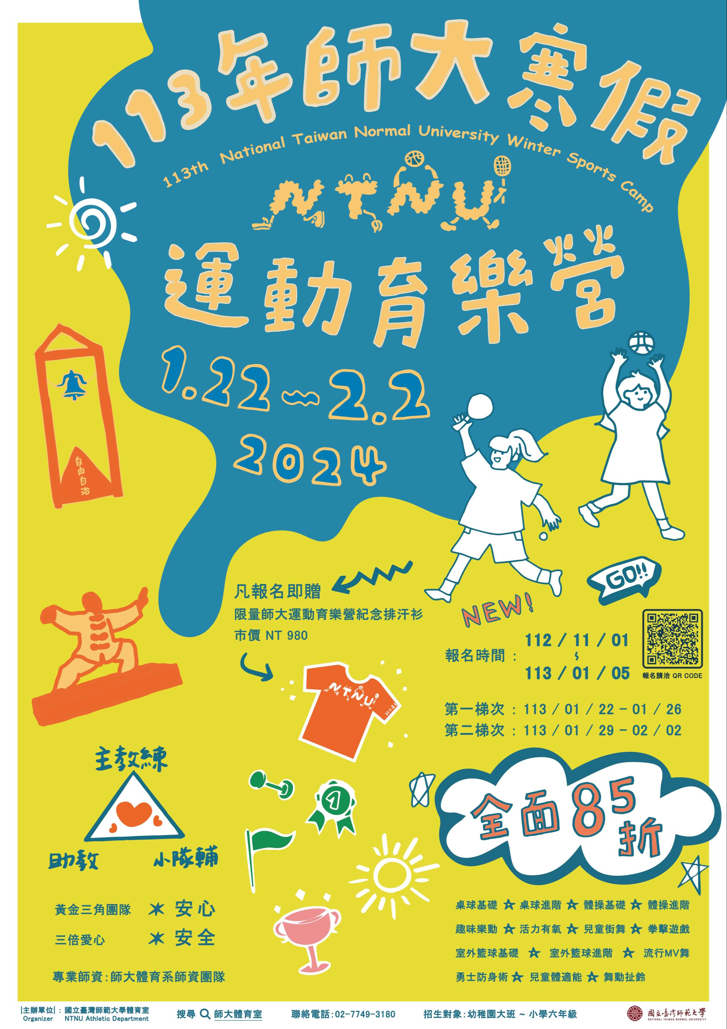 說明: 一、本校體育室為促進兒童身體發展、提升兒童體育素養,並 培養兒童運動習慣,特辦理寒假運動育樂營,以期家長更 加重視兒童體育教育。 二、本校於113年1月22日至113年2月2日開設「113年師大寒假 運動育樂營」,共兩梯次,計有14種運動項目,共20個班 別。招生對象為幼兒園大班至國民小學六年級。 三、檢附本育樂營招生海報及簡章供參。 四、敬請協助宣傳推廣貴校學生踴躍參與。