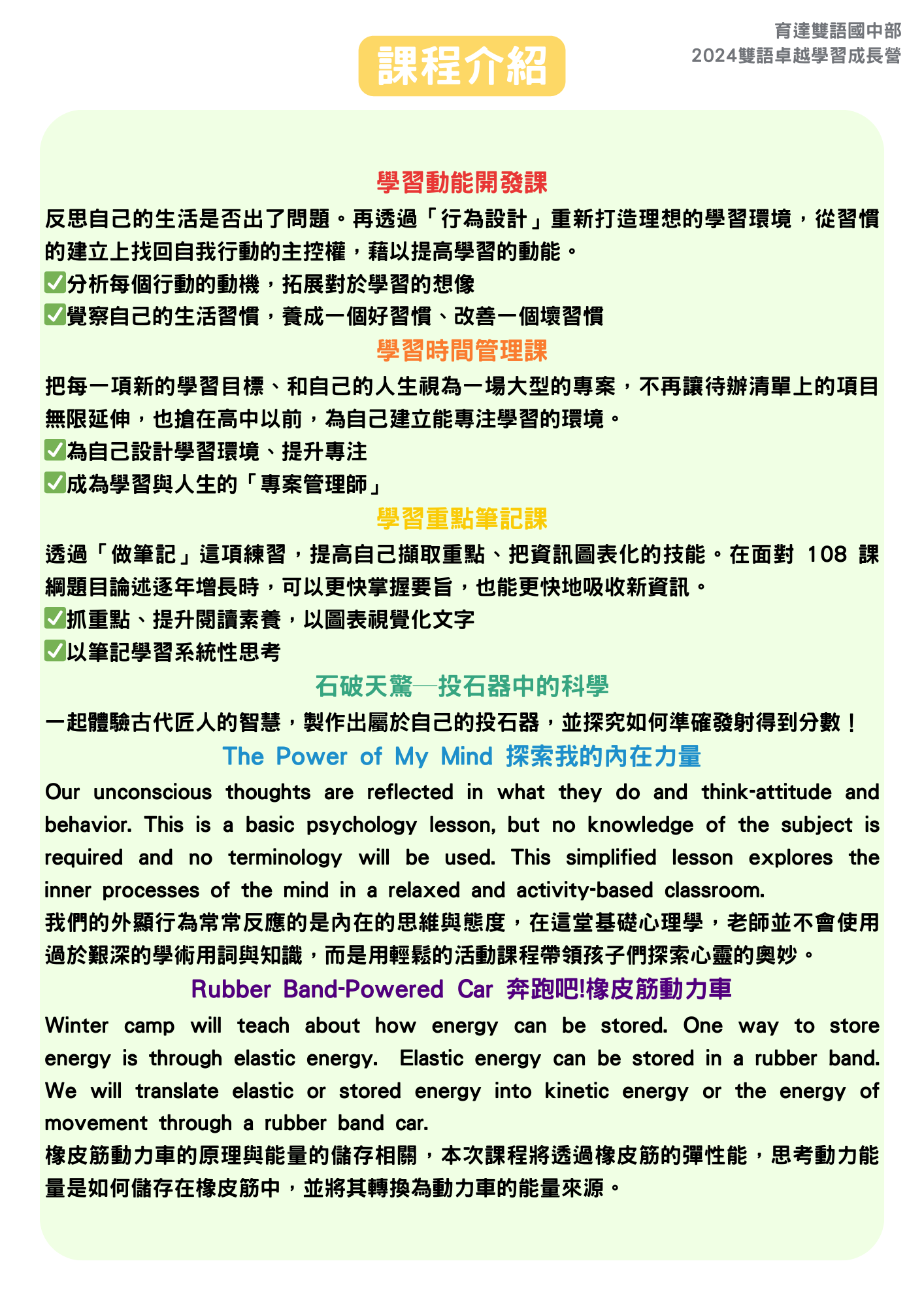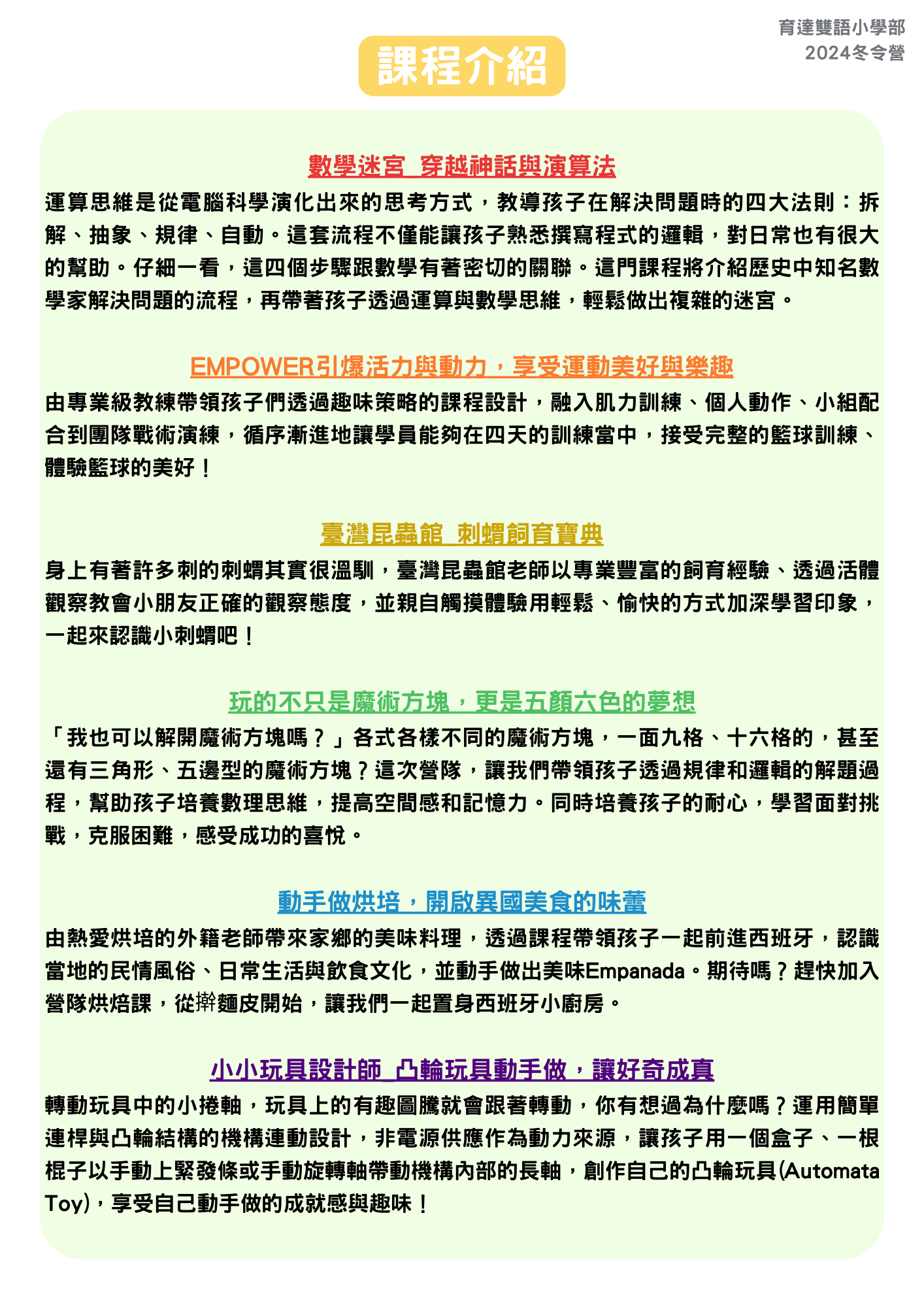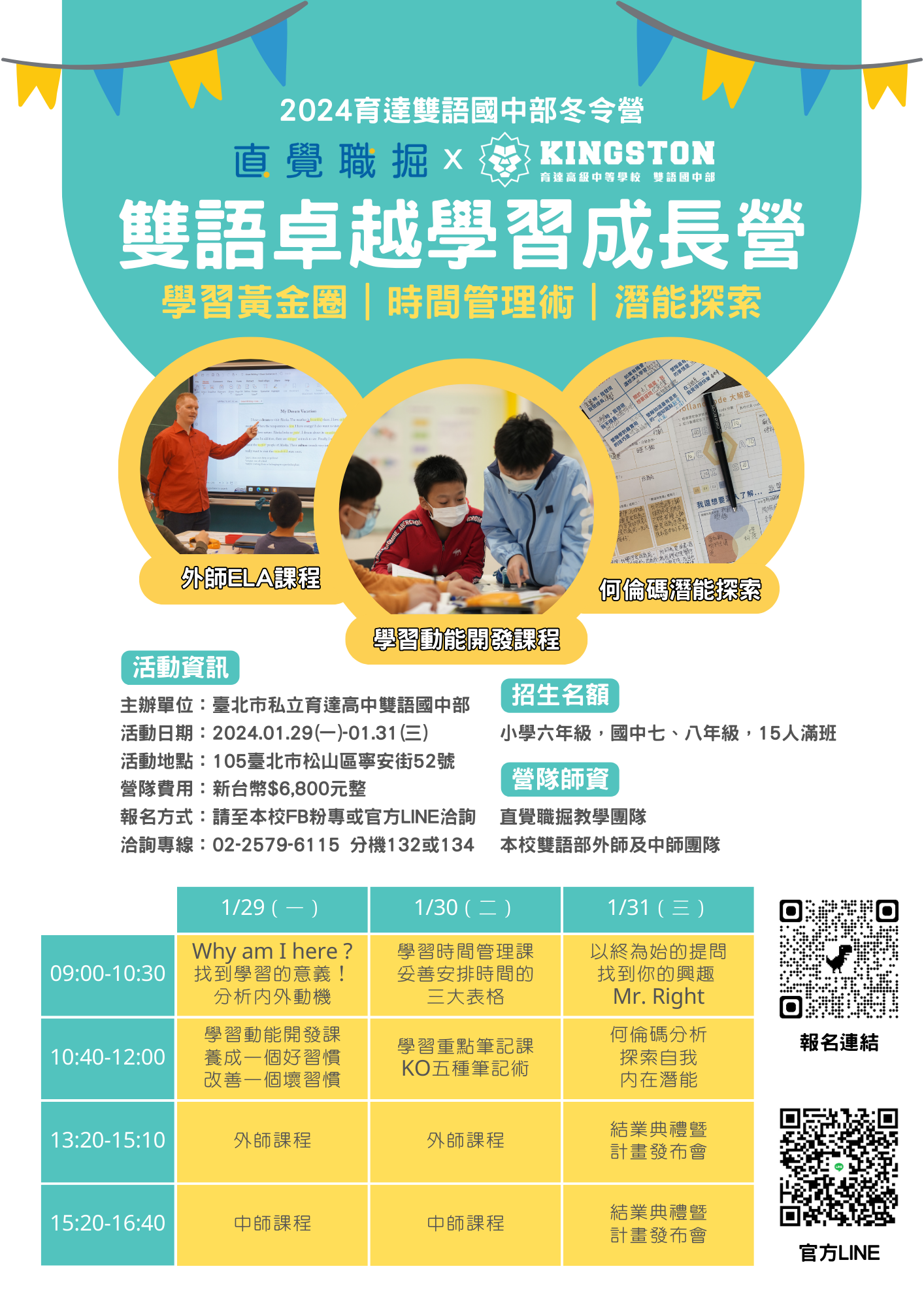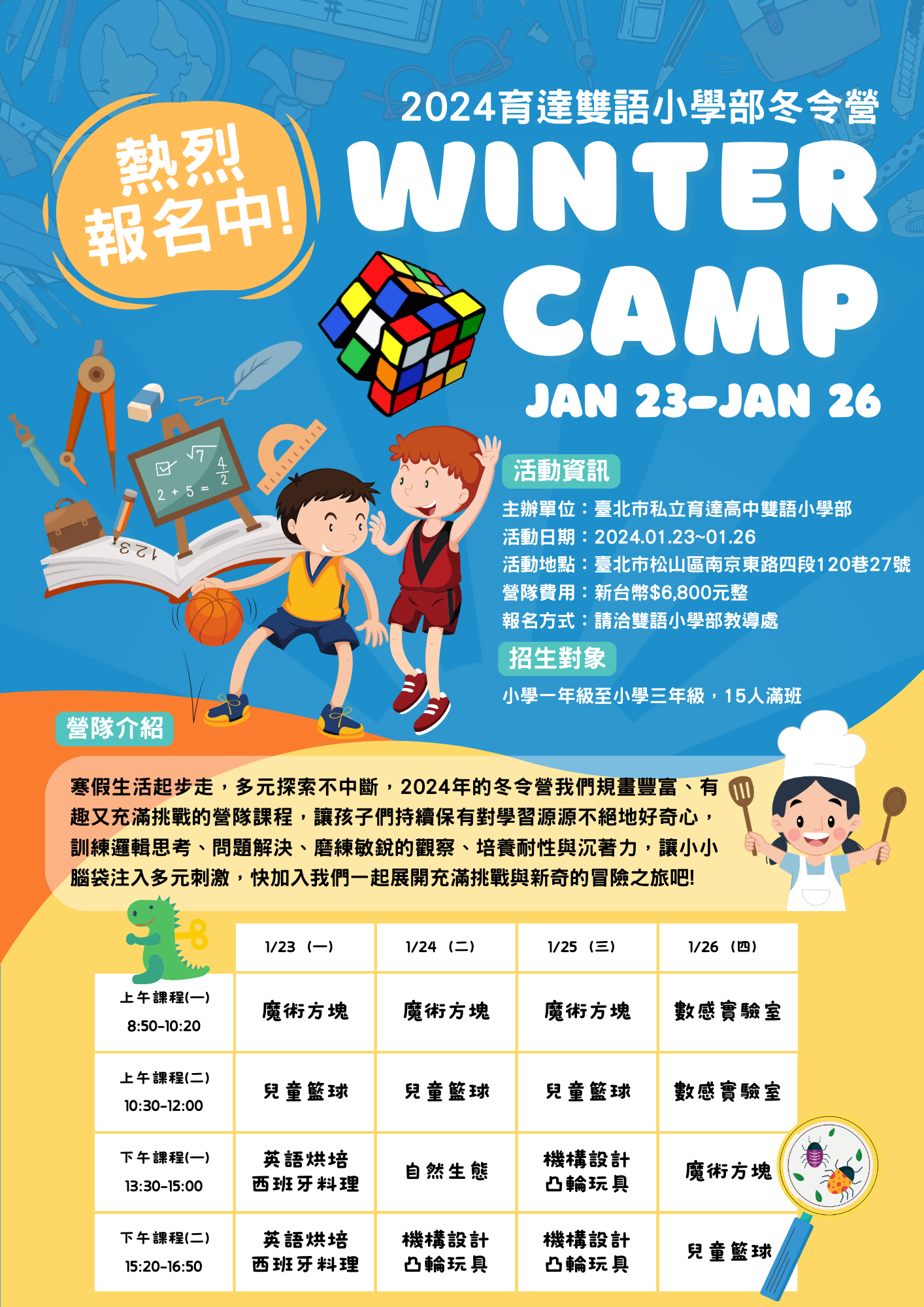 說明: 一、本校雙語小學部及國中部針對中低年級及高年級辦理2024 寒假冬令營隊,旨揭活動資訊如下: (一)本校雙語小學部2024寒假營隊: 1、活動日期:112年1月23日至1月26日上午 8:50-16: 50。 2、活動地點:本校雙語小學部(臺北市松山區南京東路 四段120巷27號)。 3、參加對象:小學一年級至三年級學生,依報名先後順 序錄取,至多15人,額滿為止。 4、活動費用:新台幣$6,800元整,包含餐點費用與活動 材料費。 5、報名網址:https://www.surveycake.com/s/9QDQ9(二)本校雙語國中部2024寒假「雙語卓越學習成長營」: 1、活動日期:112年1月29日至1月31日上午9:00-17: 00。 2、活動地點:本校思源樓雙語國中部(台北市松山區寧 安街52號)。 3、參加對象:小學六年級、國中七、八年級學生,依報 名先後順序錄取,至多15人,額滿為止。 4、活動費用:新台幣$6,800元整,包含餐點費用與活動 材料費。 5、報名網址:https://www.surveycake.com/s/Q3o6K 二、聯絡人:本校雙語部教育服務中心吳櫻卿主任、吳允文專 員。 三、連絡電話:02-2579-6115轉132、134。