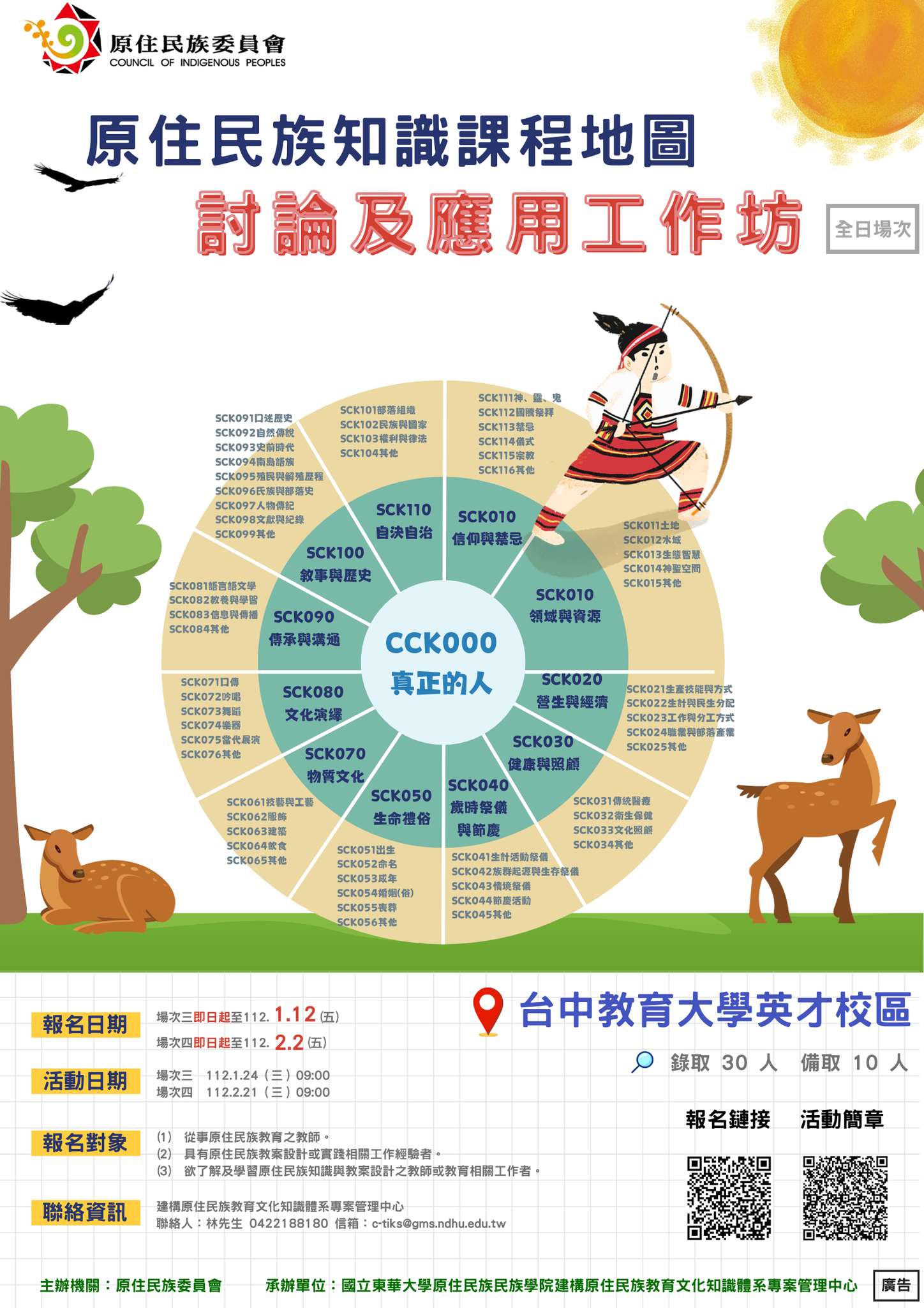 二、活動辦理導入原住民族知識雲端平台系統應用與操作,藉由資訊科技應用將國小、國中及高中不同學習階段進行原住民族教育文化課程地圖之應用與討論,參與者可以獲得資訊科技導入教育課程製作相關知能,並希望能有效轉化為實務經驗或研究,以利推動原住民族知識課程發展以及增能教師原住民族知識課程教學能量,鼓勵從事原住民族教育之教師、相關學者或原住民教案設計實踐工作者,踴躍報名。