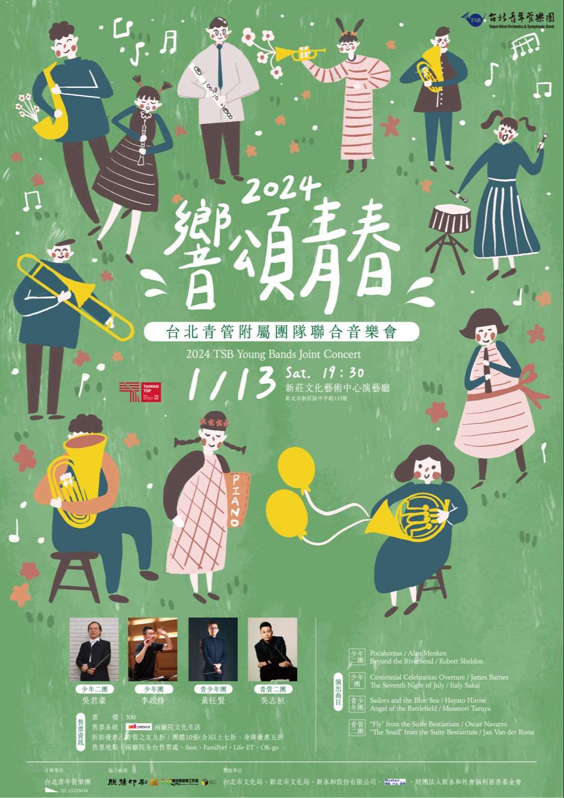 說明: 一、2024台北青管附屬團隊聯合音樂會,由台北青年管樂團二 團、台北青年管樂團附屬青少年團、台北青年管樂團附屬 少年團、台北青年管樂團附屬少年二團演出;曲目豐富多 元,好聽悅耳,展現年輕音樂家的創意與活力,歡迎闔家 一同前來欣賞。 二、旨揭音樂會相關訊息如下: (一)演出時間:113年1月13日(星期六)晚上7:30。 (二)演出地點:新莊文化藝術中心演藝廳(新北市新莊區中 平路133號)。 (三)購票與折扣優惠查詢請至兩廳院購票系統(http://0rz. tw/egFbl);相關問題請洽台北青管樂團經理王先生 (02-23223654)。 (四)相關音樂會資訊請至台北青年管樂團臉書粉絲專頁查詢(http://www.facebook.com/tsbgroup)。 三、檢附旨揭音樂會海報供參。