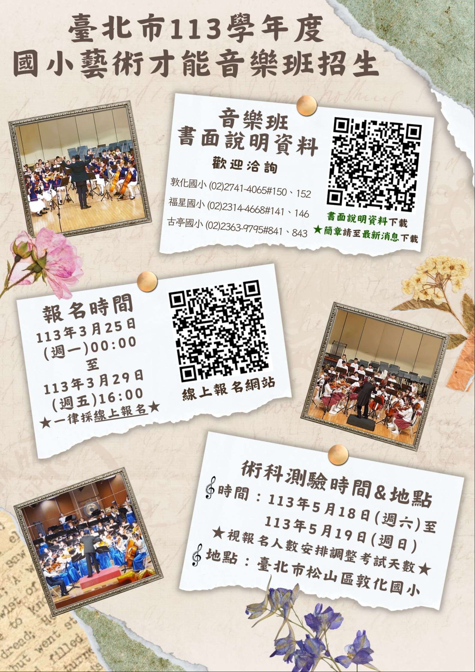 說明: 一、招生對象:限設籍臺北市之國民小學二年級、三年級、四 年級及五年級在學學生。 二、報名時間及方式:113年3月25日(星期一)00:00起至3月 29日(星期五)16:00止,於本市國中小藝才班鑑定報名 系統(https://tparttalent.tp.edu.tw)報名。 三、有關國小藝術才能音樂班招生鑑定或課程相關問題,敬請 洽詢以下學校: (一)臺北市松山區敦化國民小學輔導室(承辦):(02)2741- 4065轉150、152。 (二)臺北市萬華區福星國民小學輔導室(協辦):(02)2314- 4668轉141、146。 (三)臺北市大安區古亭國民小學輔導室(協辦):(02)2363-9795轉841、843。 四、惠請貴校予以公告所屬師生與家長,並轉知音樂性社團學 生家長相關招生及報名資訊。 五、檢附招生海報及書面說明資料各一份。