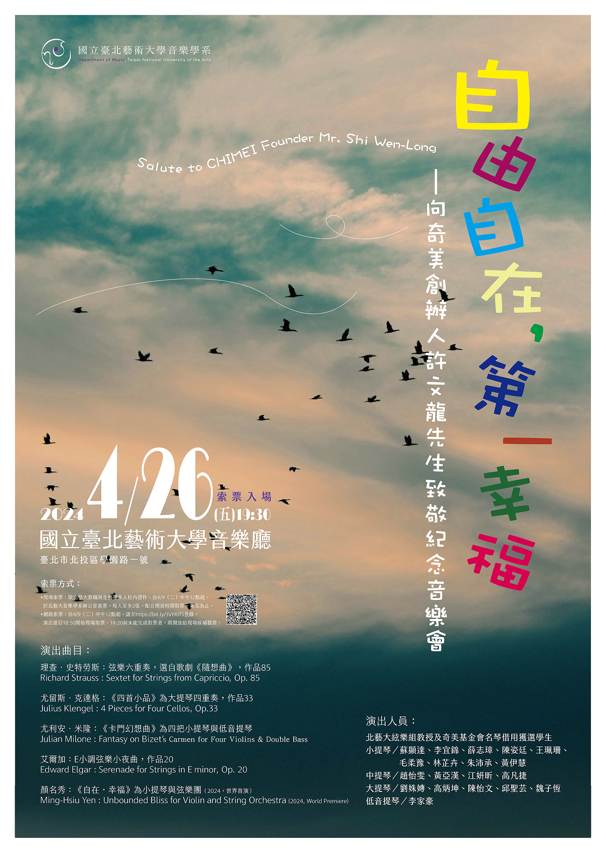 說明: 一、旨揭音樂會假本校展演藝術中心音樂廳(臺北市北投區學 園路一號)舉行。 二、索票入場,請至https://bit.ly/3Vl90TS登錄。 三、相關活動訊息請至北藝大音樂學系網站(https://music. tnua.edu.tw) 查詢。