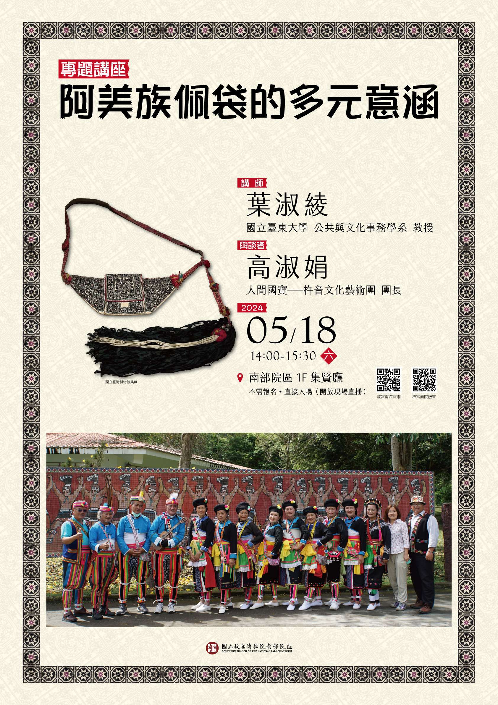 說明: 一、依據國立故宮博物院113年5月9日台博南字第1130005769號 函辦理。 二、南部院區辦理「阿美族佩袋的多元意涵」專題講座,說明 如下: (一)時間:113年5月18日(星期六)14:00-15:30。 (二)講者:葉淑綾(國立臺東大學公共與文化事務學系教 授)。 (三)與談者:高淑娟(人間國寶-杵音文化藝術團團長) (四)內容:本次講座以阿美族佩袋「'alofo」為引,深入揭 示其豐富的文化意涵,探討阿美族的行為體系、象徵網 絡以及認同意識,以及探索文化持續與變遷的樣貌。 (五)地點:南部院區集賢廳。 (六)不需門票,直接入場,演講開放線上直播,請於當日至「國立故宮博物院南部院區」臉書粉絲專頁觀看。