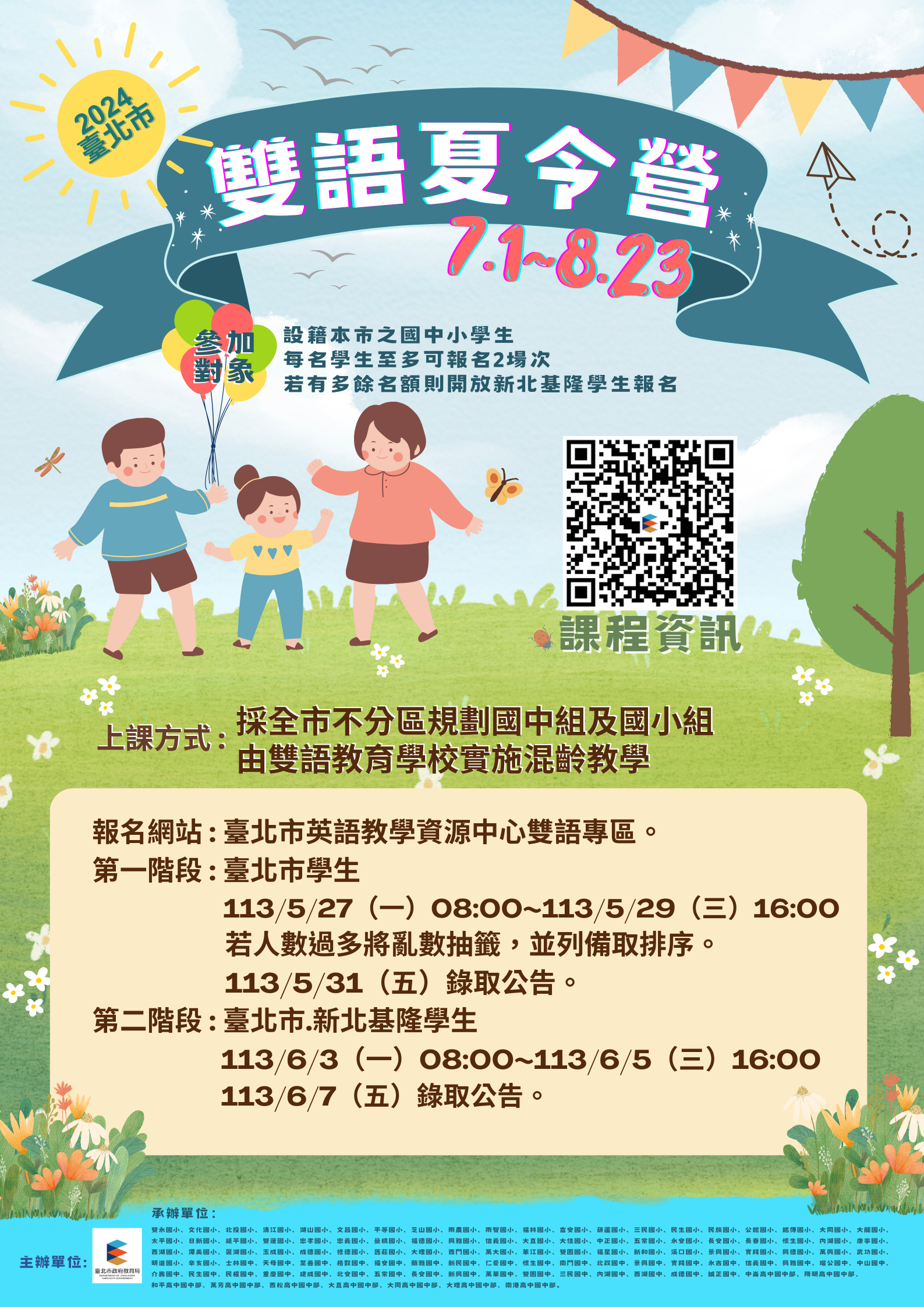5、於113年5月27日(星期一)上午8時起在臺北市英語教學資源中心雙語專區(https://ecamp.tp.edu. tw/bilingual/index.php)開放網路線上報名。