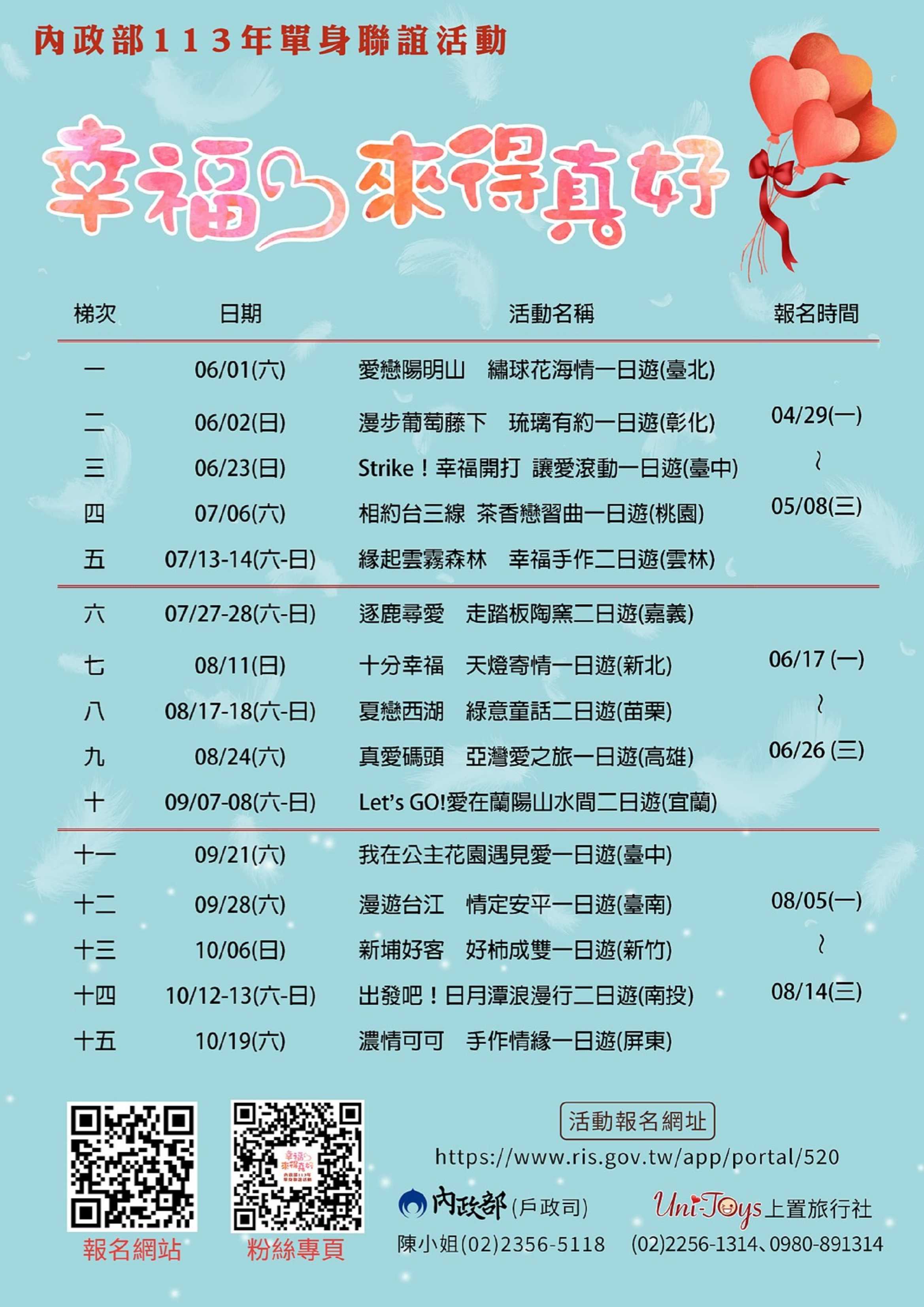 內政部113年「幸福,來得真好」單身聯誼活動第6-10梯次,6月17日至26日開放報名,歡迎踴躍報名。活動詳情及報名資訊請參閱內政部戶政司全球資訊網(主題資訊—單身聯誼活動專區)。