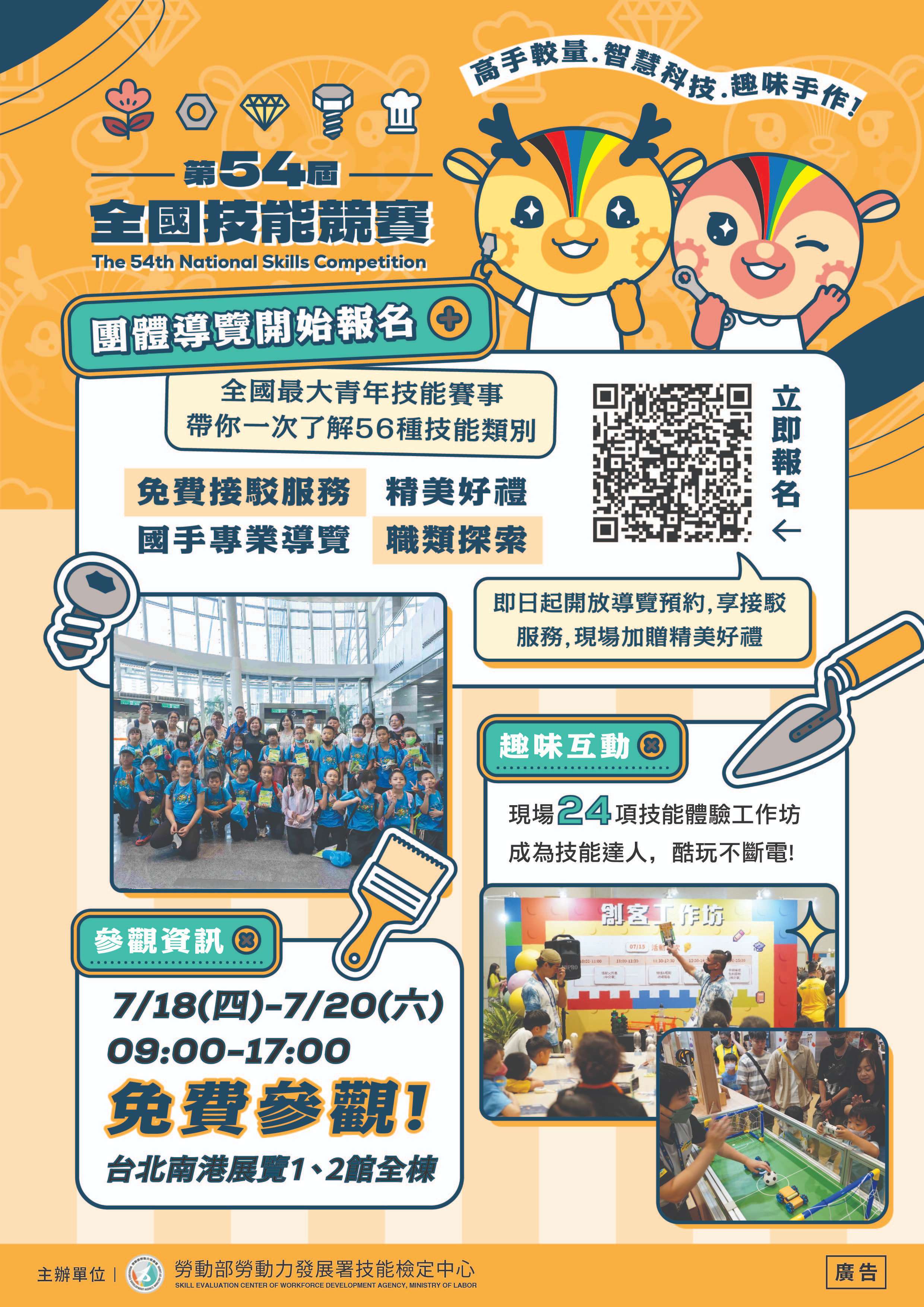 說明: 一、依據勞動部勞動力發展署技能檢定中心113年6月12日技競 字第1132100370號函辦理。 二、旨揭競賽活動訂於113年7月18日(星期四)至7月20日(星 期六)假臺北市南港展覽館1、2館(臺北市南港區經貿二 路1、2號)舉辦,本次辦理青年組56職類與青少年組13職 類,共計69職類,為職業訓練與技職教育之年度盛事。 三、旨揭競賽活動歡迎各級學校安排學生戶外教學及師生一同 蒞臨參觀,也歡迎組團親子參訪,大會將提供免費導覽 (含外語)服務,期能強化技能教育、提升學習意識,以 達到向下扎根之目的,並強化國際連結。 四、為協助交通不便之學校師生,該活動提供接送服務(需審 核:含車資與餐盒),因名額有限,採先申請先審核,請 儘速將旨揭活動排入年度行程並提出申請,以免向隅。五、承上,免費交通接送與導覽服務開放人工受理報名,隨文 檢附活動宣傳單、團體預約導覽及交通接駁服務資料,如 欲報名或有任何問題,請逕洽本活動受託單位: 台北市電 腦商業同業公會胡小姐,電話:(02)25774249轉979,電 子郵件:eileen@mail.tca.org.tw。 六、「第54屆全國技能競賽」活動資訊請洽以下宣傳平台,歡 迎轉發並鼓勵應用。 (一)活動官網:https://skillsweek.wdasec.gov.tw /skillsweek/。 (二)FaceBook:https://www.facebook.com/WDASEC。 (三)Instagram:https://www.instagram.com /worldskillstw/。 七、檢附全國技能競賽海報及團體預約導覽及交通接駁服務資 料各1份。