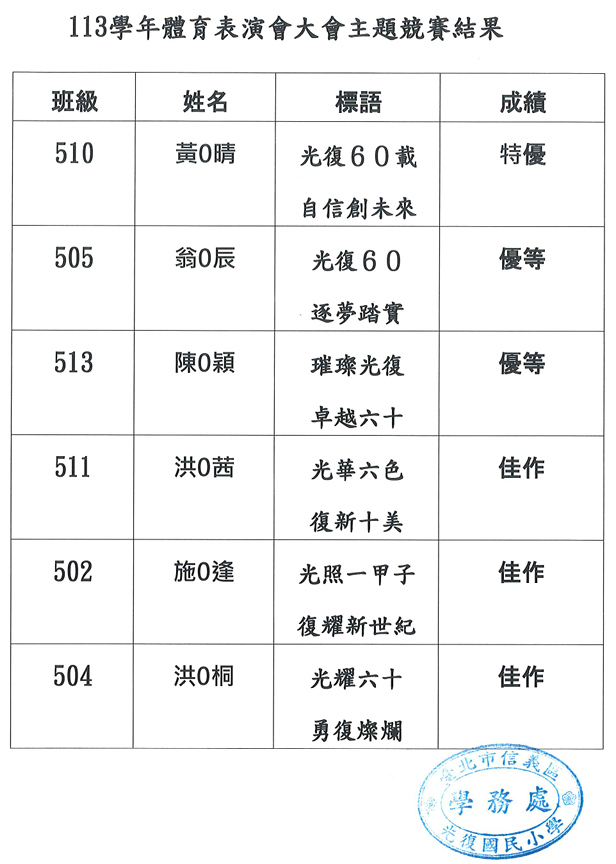 恭喜以上獲獎同學,獲得特優標語將成為本學年體表大會主題!