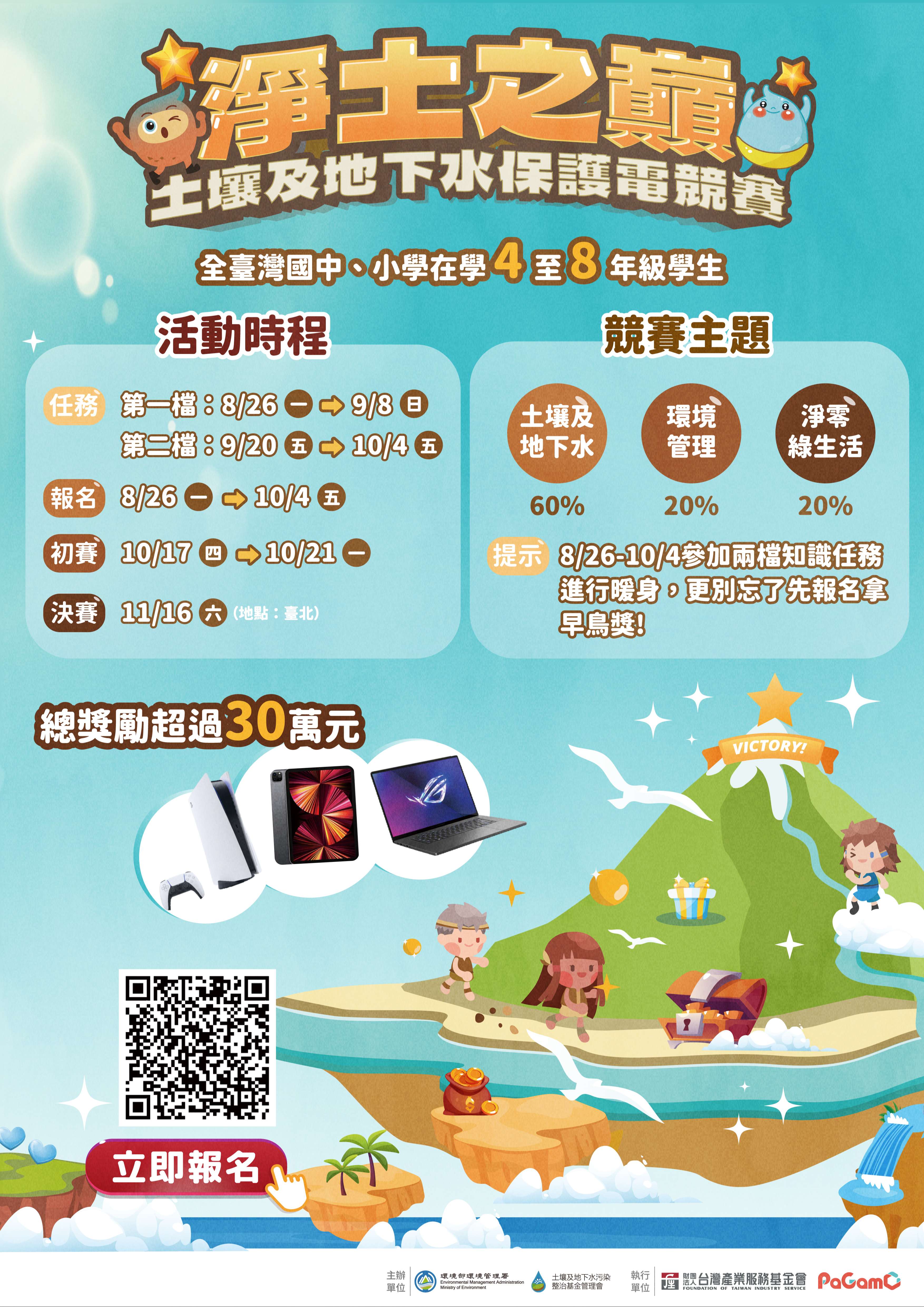 說明: 一、依據環境部環境管理署113年8月23日環管土字第 1137123636號函辦理。 二、為提升全國民眾了解土壤及地下水環境保護之重要,該署 特辦理旨揭電競賽活動,競賽對象為國小四年級至國中八 年級之在校生。 三、本活動自113年8月26日(星期一)中午12時開放報名,至 113年10月4日(星期五)中午12 時截止,本次活動提供合 計價值超過新臺幣30萬元的豐富獎勵,只要取得決賽資 格,並參與決賽,即可獲得至少價值3,000元的禮券(詳海 報)。 四、徵選對象及參與方式(活動網址:https://reurl.cc/vvdZXe): (一)本次競賽為「個人賽」賽制。 (二)一人僅能以一組PaGamO帳號報名。 (三)每人須由一位家長或老師帶領報名。 五、競賽題目分為三類「土壤及地下水、環境管理及淨零綠生 活」。競賽活動相關資訊請上該署土壤及地下水污染整治 網最新消息(https://sgw.moenv.gov.tw /Public/news )或見活動網站(https://reurl.cc /vvdZXe)或「土淨 水清」粉絲專頁(https://www. facebook.com /sgwmoenv)。