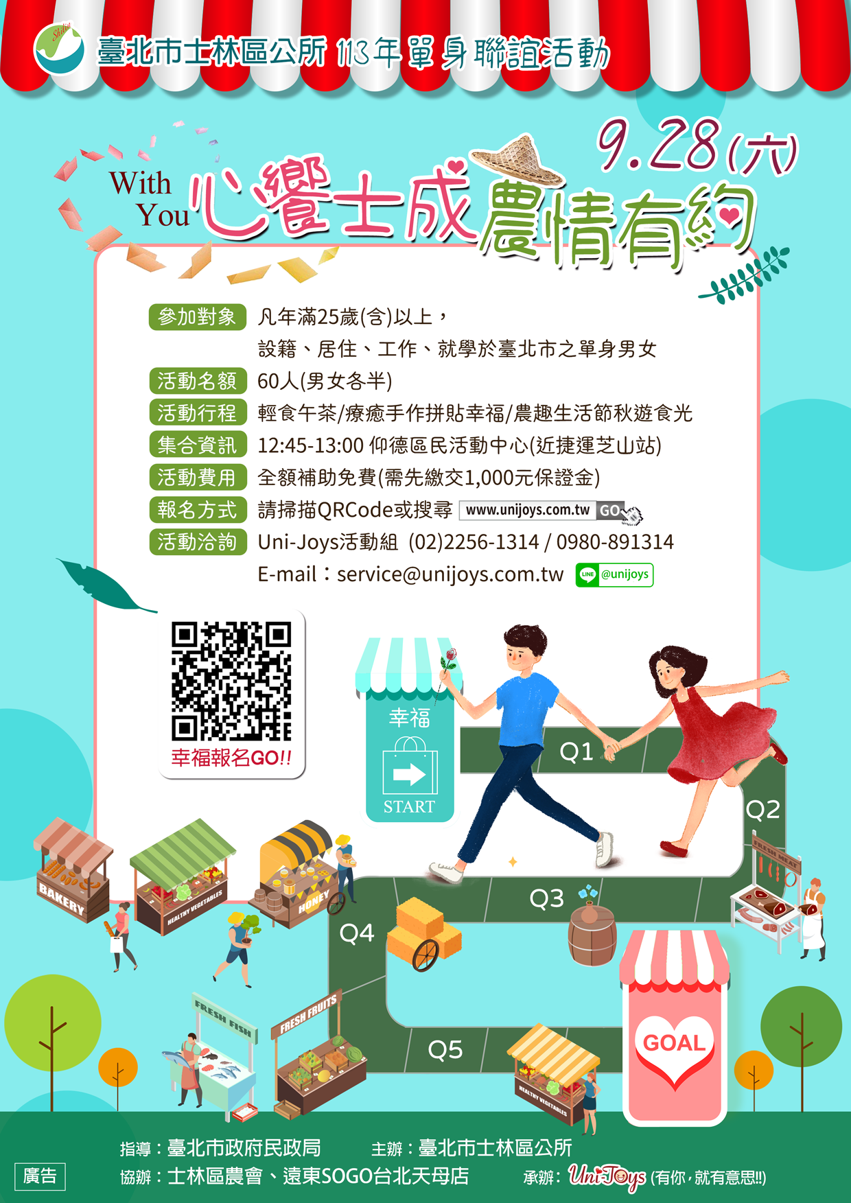 臺北市士林區公所113年『心饗士成-農情有約』單身聯誼活動,將於113年9月28日(星期六)12時45分至18時,假士林區仰德區民活動中心及遠東SOGO百貨士林3號廣場舉辦,自即日起開放網路報名至113年9月6日(星期五)或額滿為止,活動名額為男、女性各30人,共60人,歡迎年滿25歲(含)以上設籍、居住、工作或就學於臺北市之未婚單身男女踴躍報名參加,詳情請見報名簡章及士林區公所官網最新消息或電洽(02)2882-6200分機6502宋小姐。