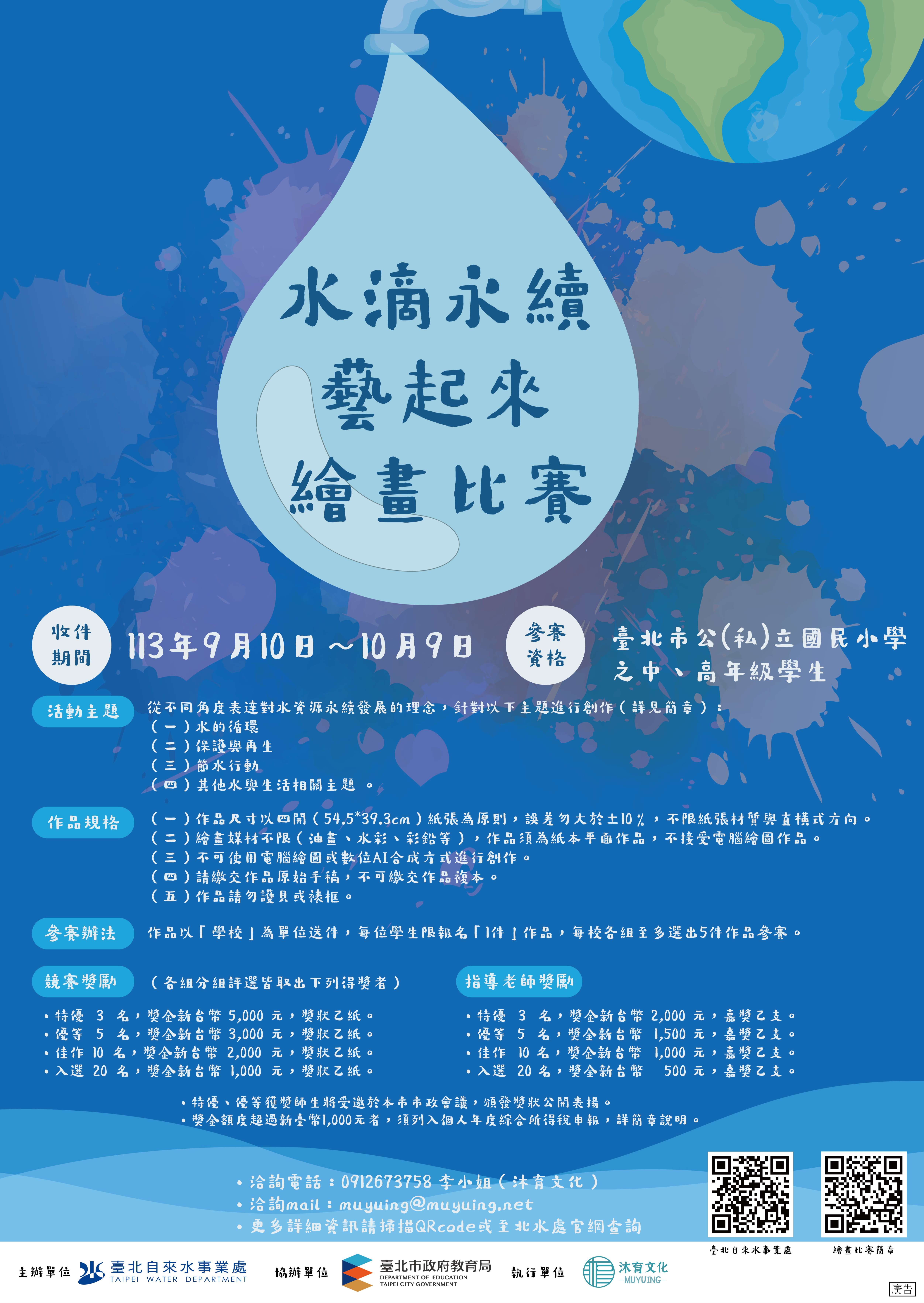說明: 一、本處為讓學童對水資源永續利用、節約用水有更深刻體 認,於113年9月10日至10月9日辦理旨揭比賽,期藉由藝術 創作的方式,鼓勵教師將水資源教育融入教學並指導學生 參賽。 二、為提升師生參賽意願,本案同時獎勵獲獎學生及其指導教 師,請貴校鼓勵師生踴躍報名參賽。 三、檢送113年「水滴永續藝起來」繪畫比賽簡章及海報各1份 (如附件)。