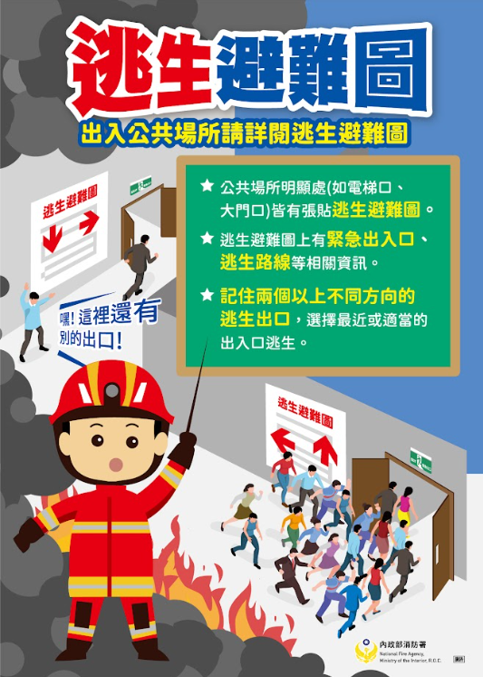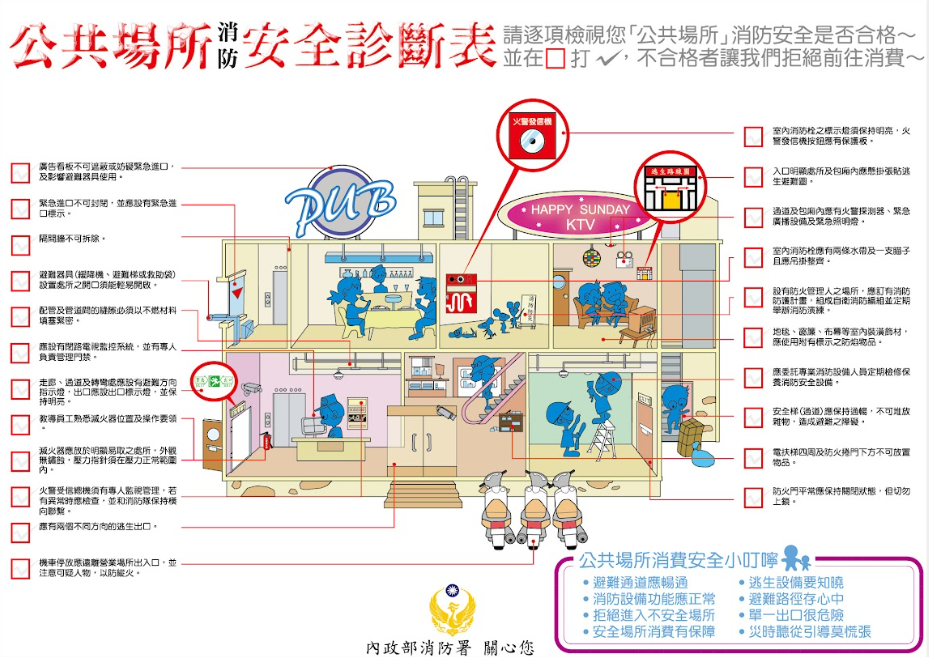 為提醒民眾進入公共場所應保持警覺,確認場所是否張貼 「不合格場所」告示,並留意消防安全設備位置及逃生動線,以確保自身安全。