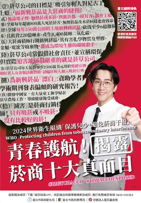 世界衛生組織(WHO)2024年菸害防制主軸為「揭露菸商真面 目:保護兒少,避免菸商干擾」。