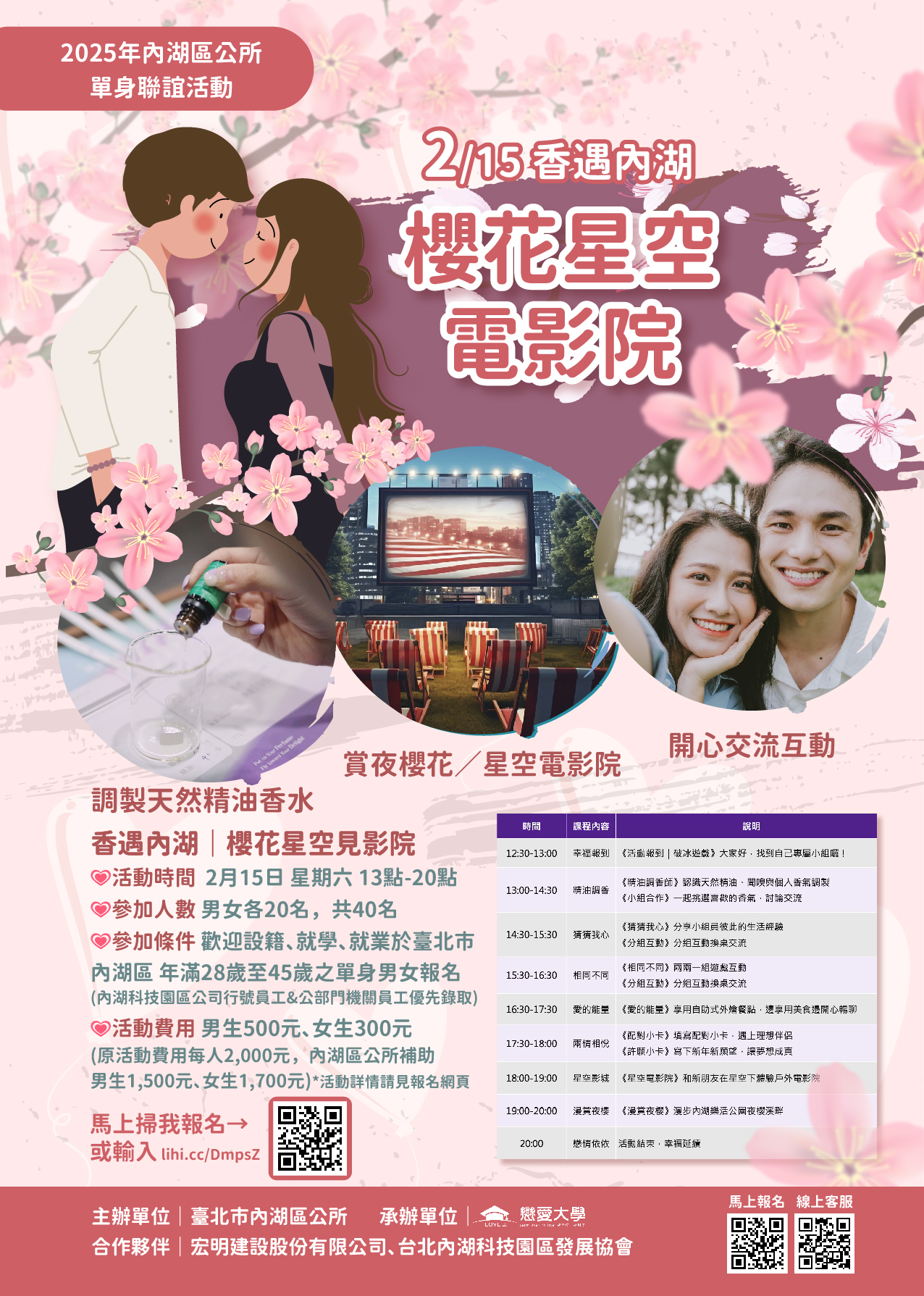 一、為鼓勵國人適齡婚育,推廣「樂婚、願生、能養」人口政 策,及促進公私部門同仁員工擴展交友圈,臺北市內湖區公所將於114年2月15日(星期六)舉辦「香遇內湖,櫻花星空電影院」單身聯誼活動。