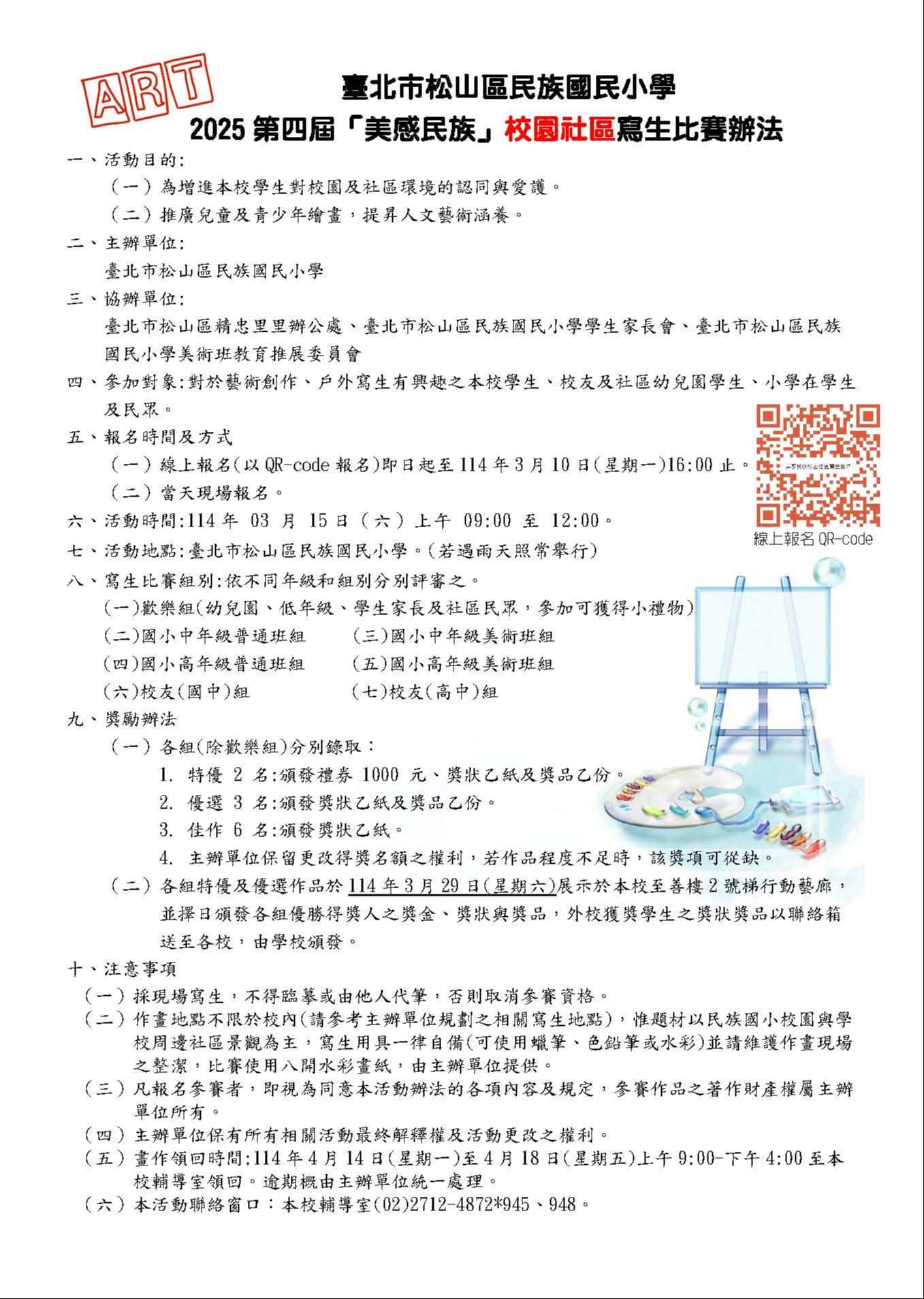 一、比賽時間:114年3月15日(星期六)早上9時至12時整。比賽 地點:臺北市民族國小(臺北市松山區民生東路四段97巷7 號),若遇雨天照常舉行。