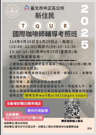臺北市中正區公所將於114 年4月30日至6月29日止,每週三(18:00~21:00)與週六(09: 30~12:30、13:30~16:30)於臺北市中正區中華路二段315巷 14號2樓(南機場樂活園地旁邊)辦理新住民課程,其中6 月29日(星期日)為檢定日及成果發表暨同樂會,預計共 17堂課咖啡專業課程。報名方式採網路線上報名,114年3 月3日上午9時30分起受理報名,將依報名時間依序錄取至 額滿為止,歡迎符合資格新住民報名參加,詳情請洽2341- 6721轉317張小姐。