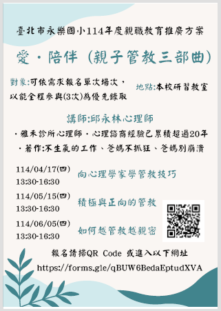 五、報名截止日期:自即日起至每場講座前一日止。報名連結: https://forms.gle/S2BVMEt1ShXQVBuF9,或電洽本校輔導 室詹老師02-2553-4882#503。
