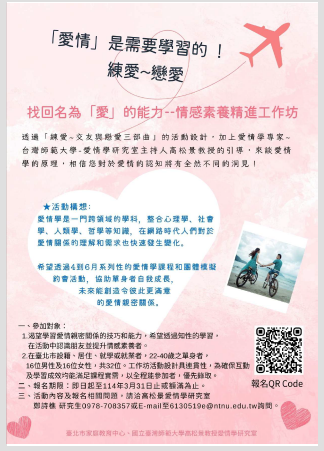 一、工作坊以人際關係及情感互動為主軸,藉由連續性的活動 方式,透過講師分享、模擬約會及手作體驗等方式,提升 參與者對於自我認識及情感互動技巧。
