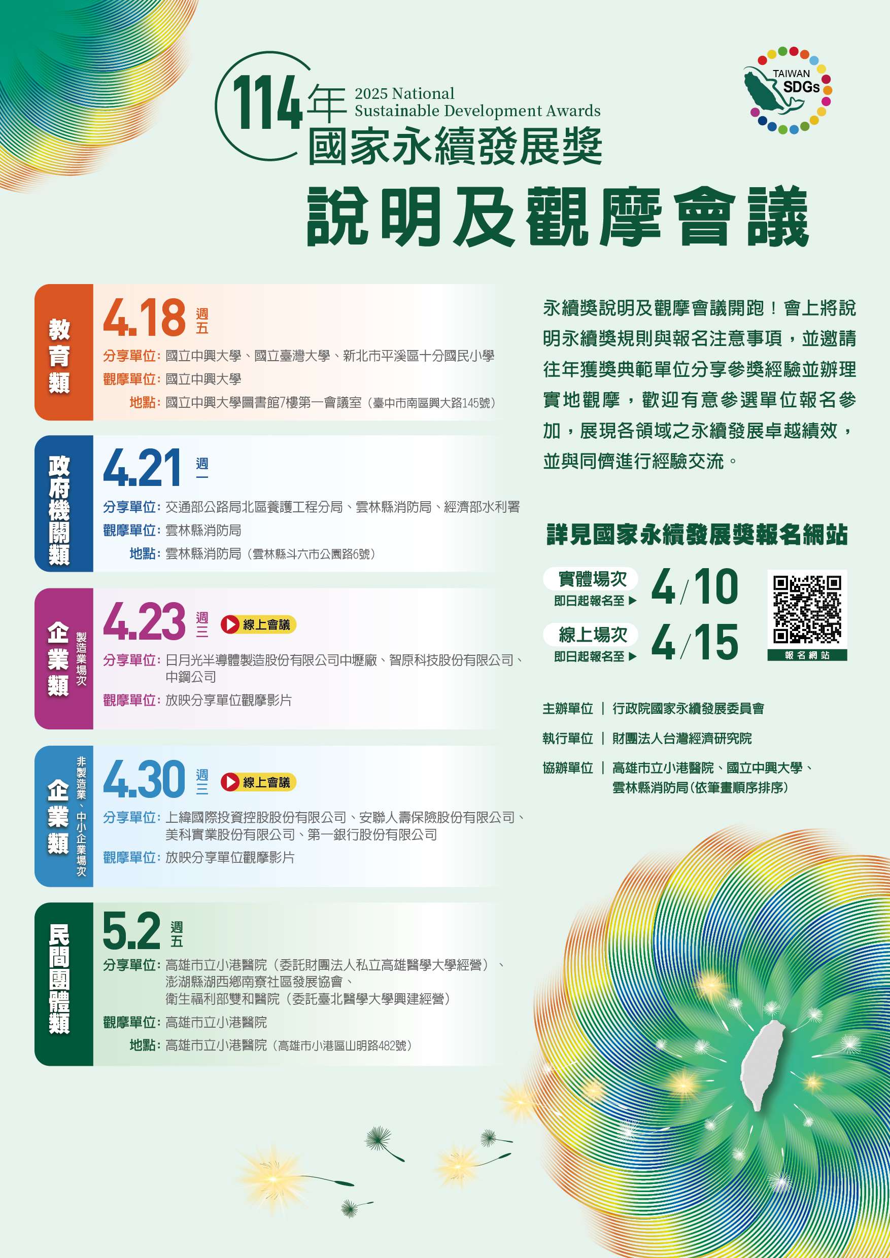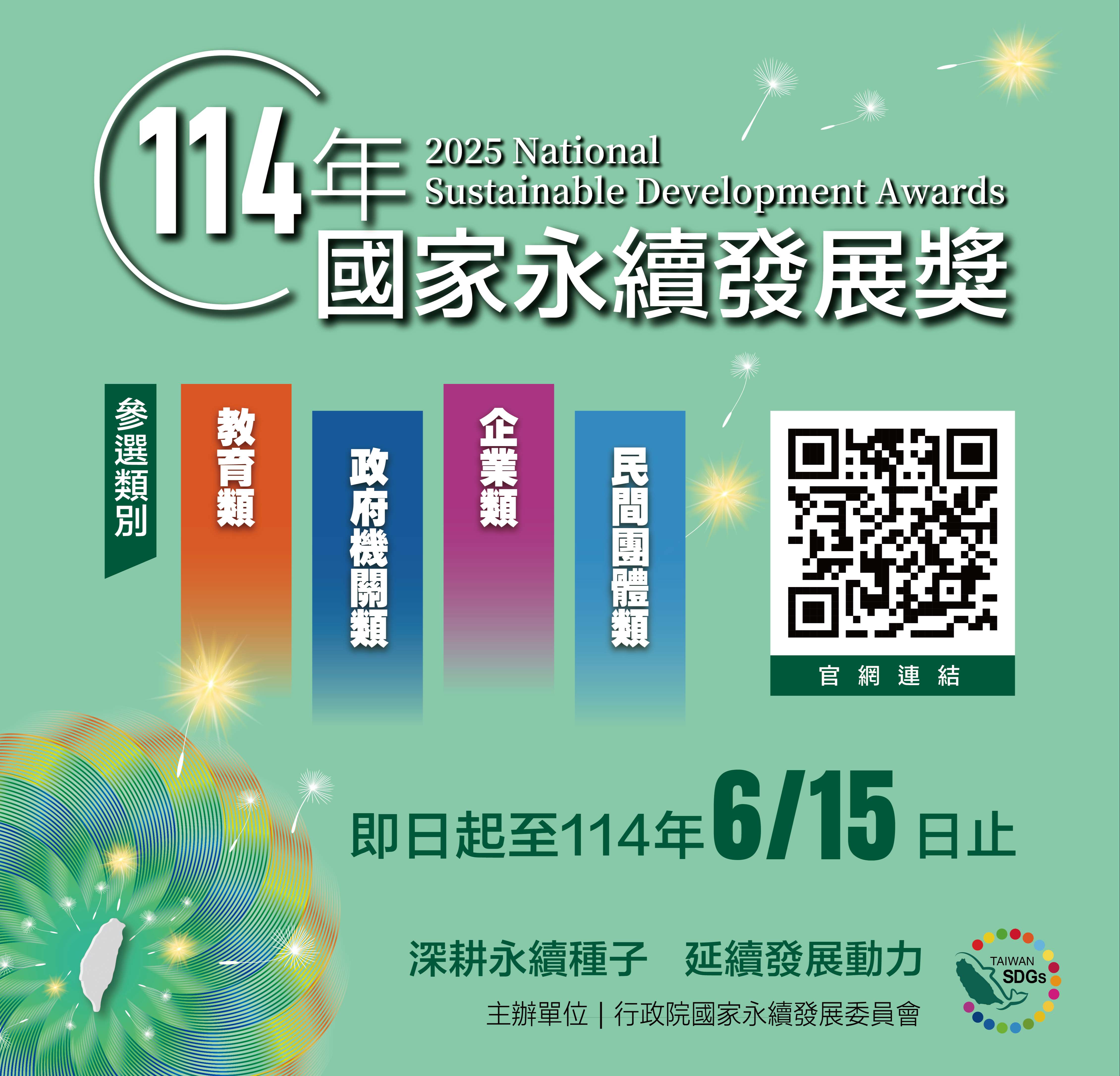 說明: 一、依據行政院國家永續發展委員會秘書處114年3月20日永續 秘字第1146000015號函辦理。 二、「114年國家永續發展獎」採網路線上報名方式,請有意參 加教育類選拔者,參酌選拔表揚計畫,於114年6月15日前 至國家永續發展獎網站,填列報名表格並上傳相關資料, 完成報名程序(報名網址:https://ncsdaward.ndc.gov. tw/)。 三、為增進各界對於國家永續發展獎之瞭解,並促進永續發展 相關經驗互相交流與分享,行政院國家永續發展委員會另 舉辦「114年國家永續發展獎說明及觀摩會議」,可免費線上報名,歡迎有意參加選拔者踴躍參加,教育類場次資訊 如下: (一)時間:114年4月18日(星期五) (二)地點:臺中國立中興大學圖書館7樓第一會議室(臺中 市南區興大路145號) (三)報名網址:https://tier.surveycake.biz/s/aqAXY